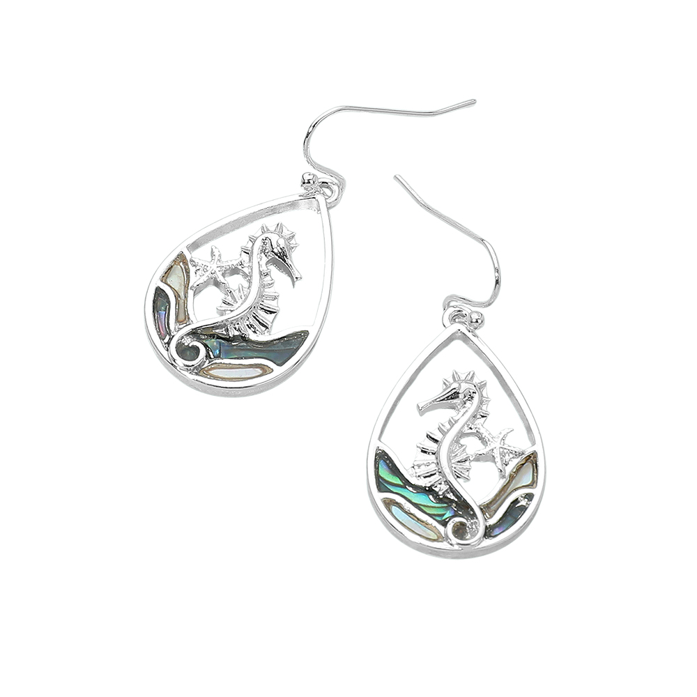 Details • Size : 0.75" X 1.4" • Fish Hook Back • Ocean-inspired teardrop dangle earrings featuring a detailed seahorse and flowing wave motif. Designed to move beautifully and add coastal charm, they complement everyday outfits, resort looks, and vacation styling. A standout choice for beach boutiques, seaside collections, and gift-ready accessory assortments. • Lead and Nickel Compliant