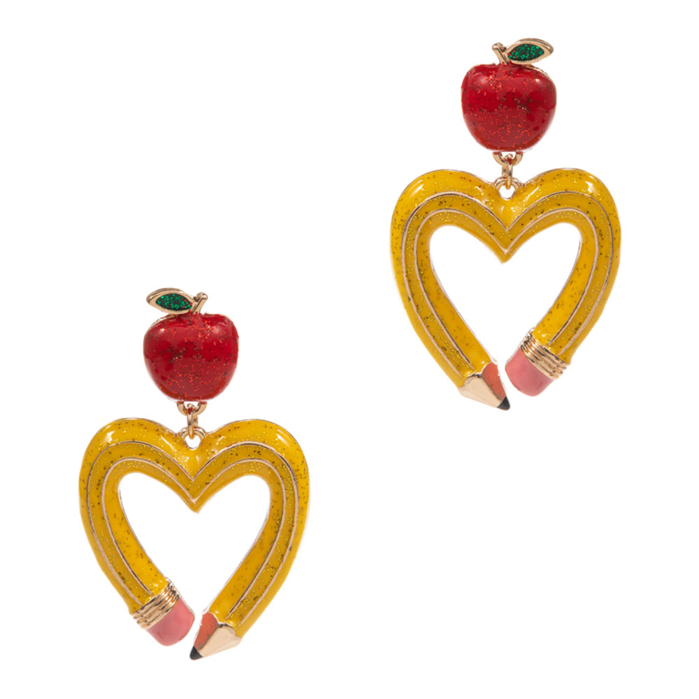 Details • Size : 1.2" X 1.75" • Titanium Post Back • Playful drop earrings featuring an apple charm paired with a heart-shaped pencil design for a school-inspired statement. Lightweight and fun, they elevate casual looks, themed outfits, classroom events, or gift ideas while remaining comfortable for all-day wear. • Hypoallergenic • Lead and Nickel Compliant