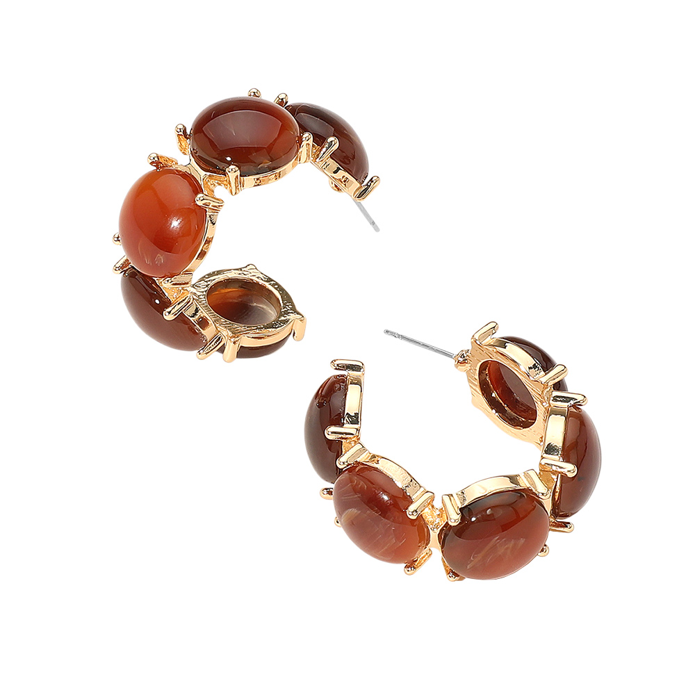 Details • Size : 1.3" X 1.3" X 0.5" • Post Back • Add earthy elegance to your outfit with these gold hoop earrings featuring bold oval gemstone-like accents. Their rich finish and sculptural design bring a luxe boho vibe to both casual and formal looks. A standout accessory for confident, modern styling. • Lead and Nickel Compliant