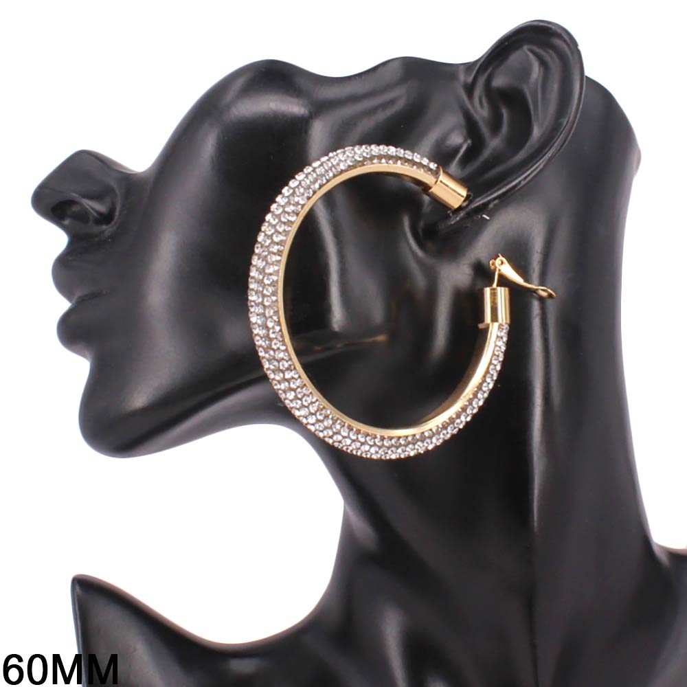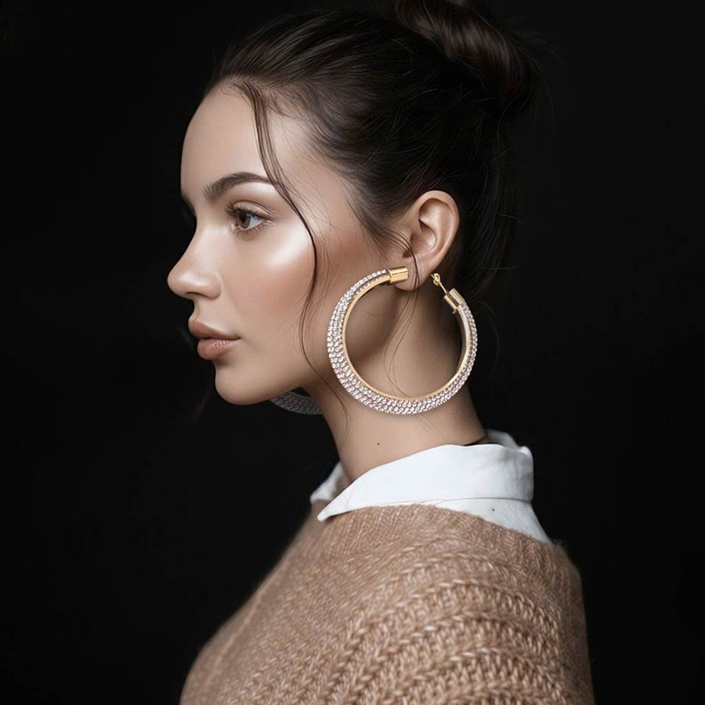 • Statement hoop earrings designed with a sleek curved silhouette and fully embellished surface for maximum shine. The bold 60mm size creates instant impact while remaining lightweight and comfortable for extended wear. Ideal for parties, festivals, night events, and trend-forward jewelry collections.