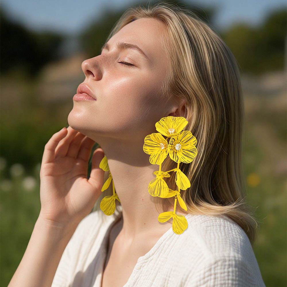 • Eye-catching floral cascade drop earrings designed to create elegant movement and bold impact. Features layered flower details with a lightweight feel, perfect for boutiques, resort wear, special events, and trend-forward collections seeking standout statement accessories.