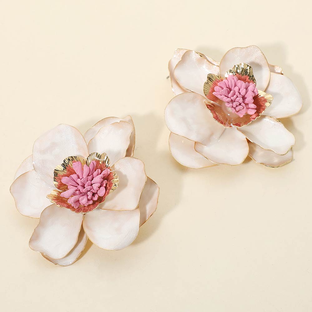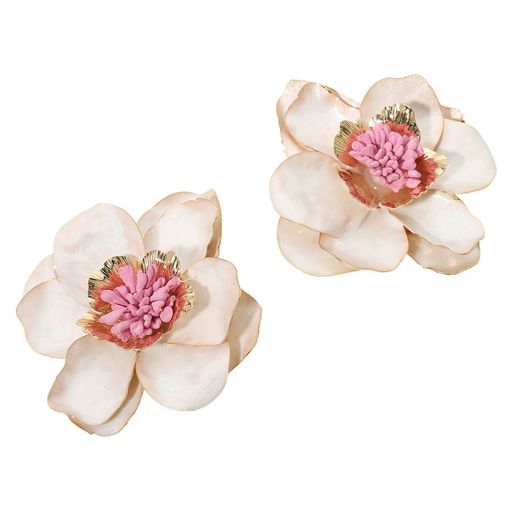 • These bold floral statement stud earrings feature layered petal detailing with a dimensional center for a sculpted, eye-catching look. Designed to elevate everyday outfits or special occasion styling, they offer standout appeal for boutiques, gifting, and trend-focused jewelry collections.