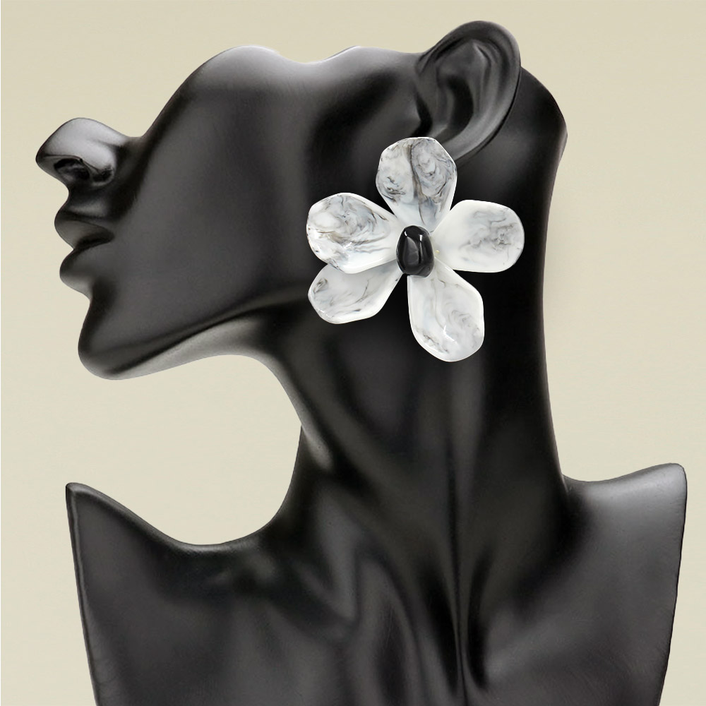 Details • Size : 2.5" X 2.5" • Post Back • Bold statement earrings featuring large petal-shaped floral design with glossy finish. Perfect for elevating any outfit, these eye-catching earrings add a touch of artistic flair and elegance, ideal for special occasions, photoshoots, or standout fashion looks. • Lead and Nickel Compliant