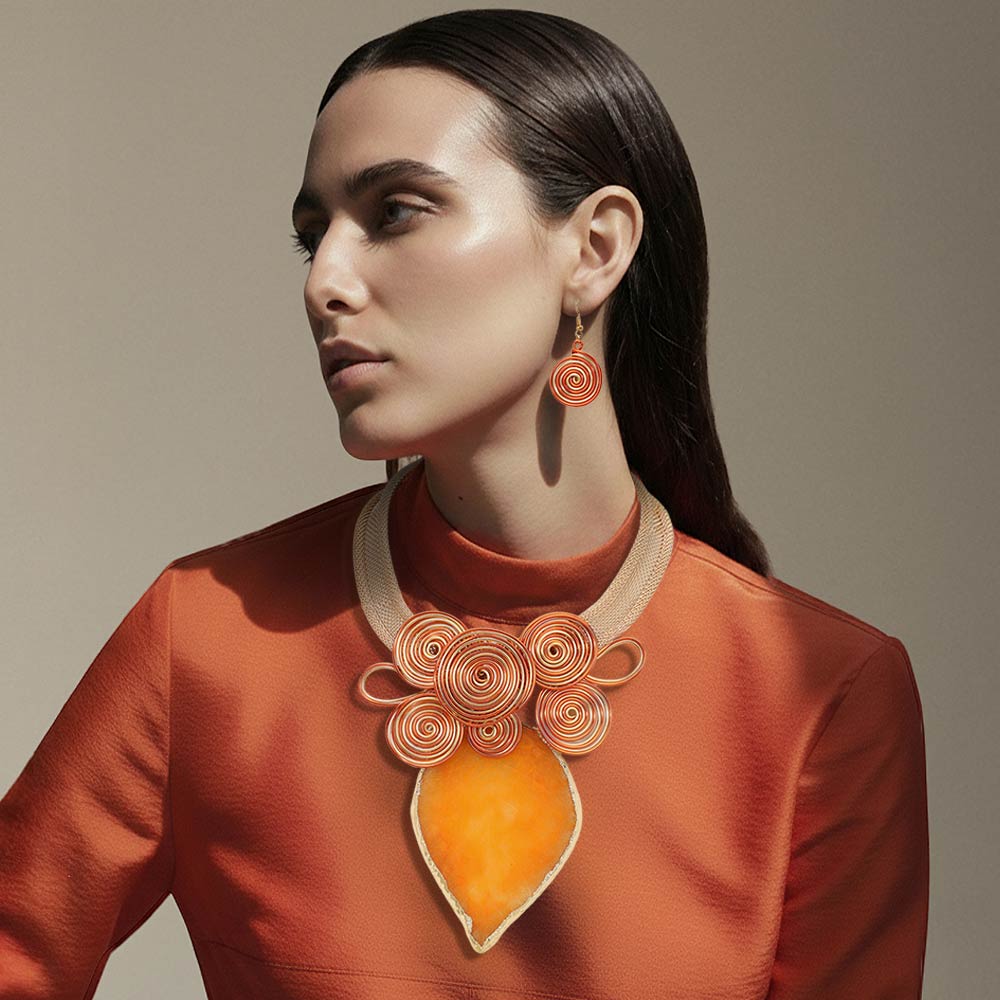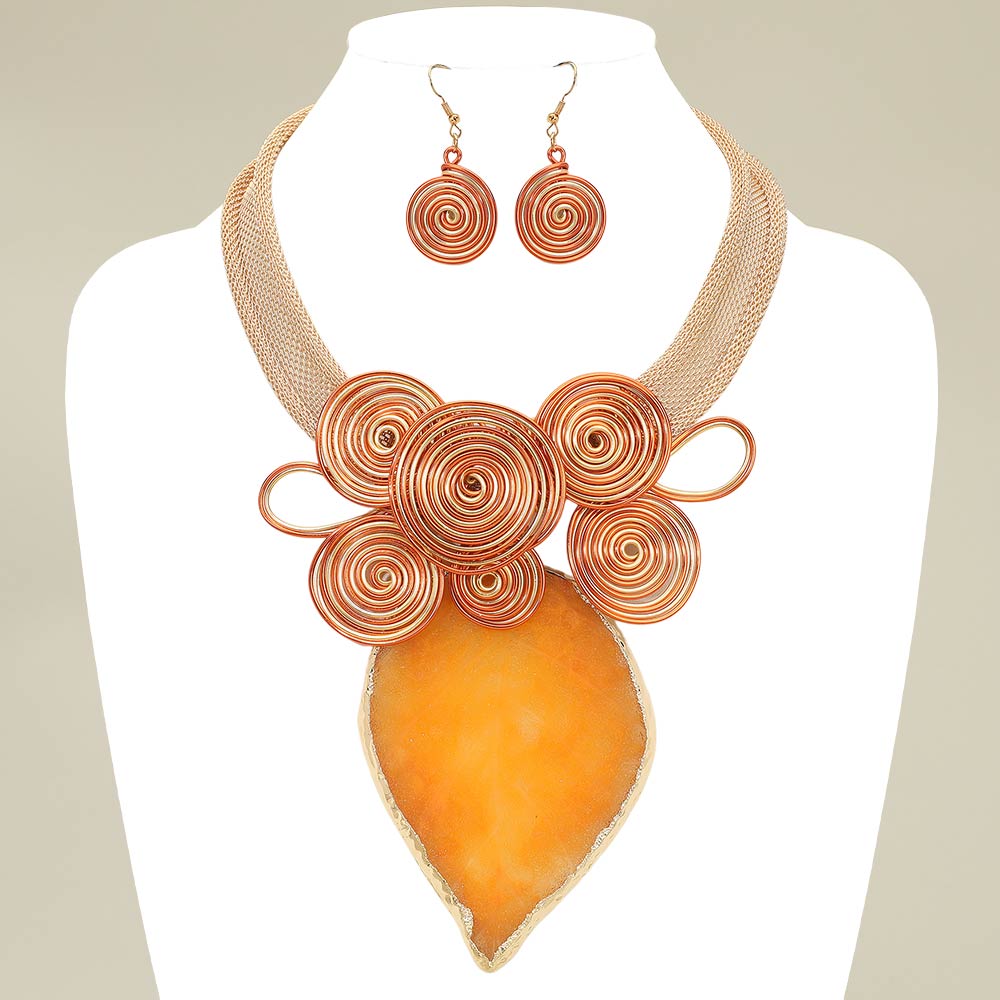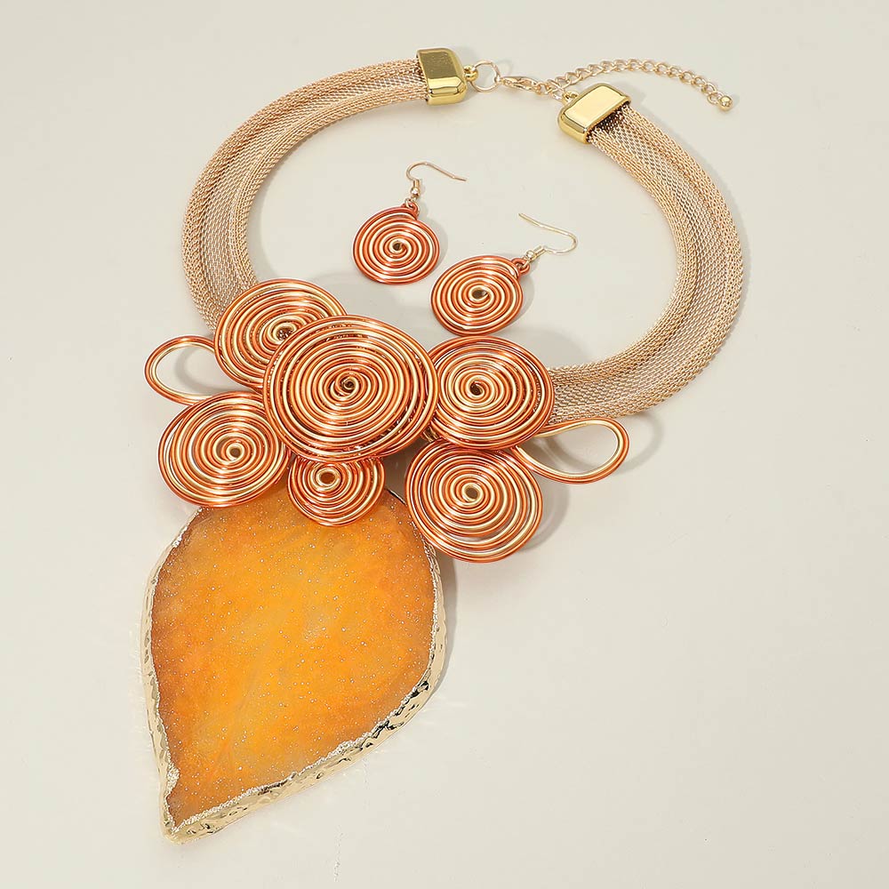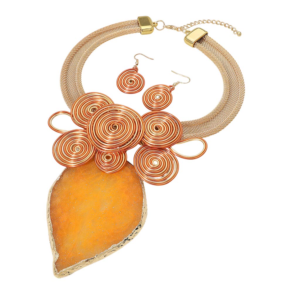 • This spiral pendant statement necklace set features layered circular wire accents paired with a bold centerpiece and coordinating drop earrings. Designed to create a modern artistic look, it adds strong visual impact and texture, making it ideal for boutiques seeking standout accessories for statement styling, special occasions, and elevated everyday outfits.