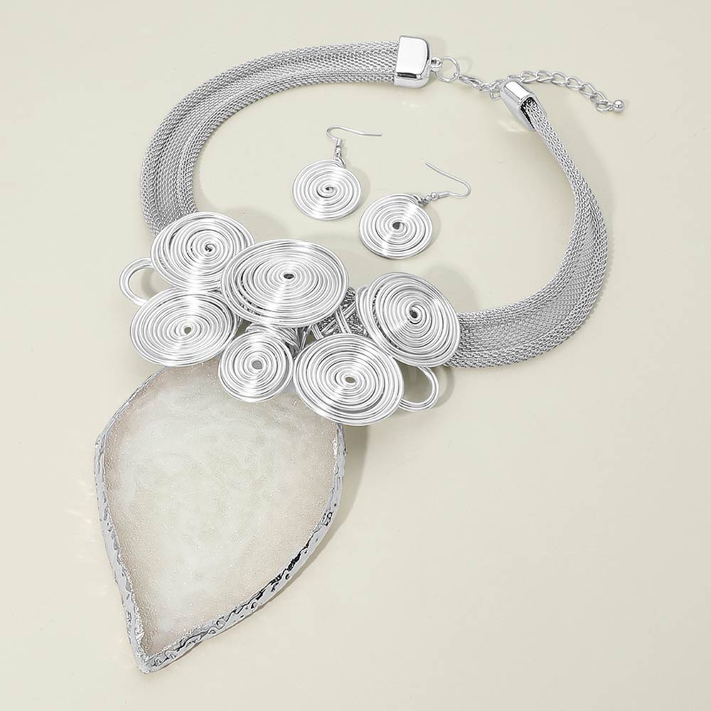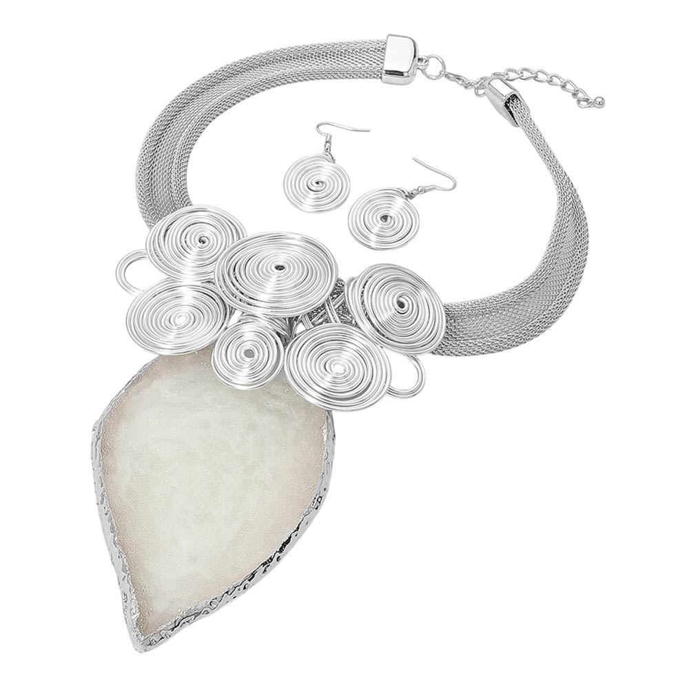 • This spiral pendant statement necklace set features layered circular wire accents paired with a bold centerpiece and coordinating drop earrings. Designed to create a modern artistic look, it adds strong visual impact and texture, making it ideal for boutiques seeking standout accessories for statement styling, special occasions, and elevated everyday outfits.