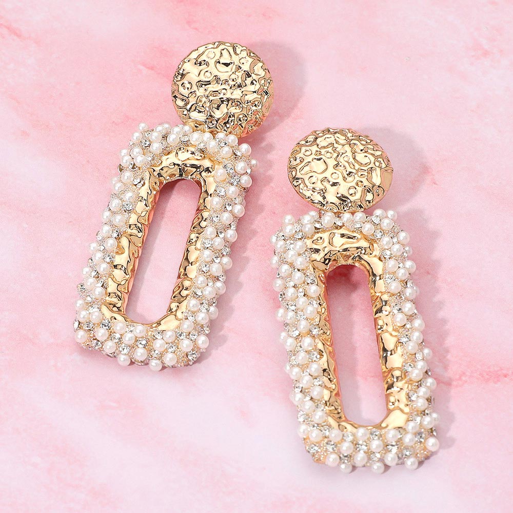 Details • Size : 1.2" X 2.75" • Post Back • These hammered metal pearl border drop earrings blend a textured metallic surface with refined bead detailing for a luxurious finish. Their elongated open shape creates a graceful silhouette, making them ideal for adding a touch of sophistication and modern glamour to any ensemble. • Lead and Nickel Compliant