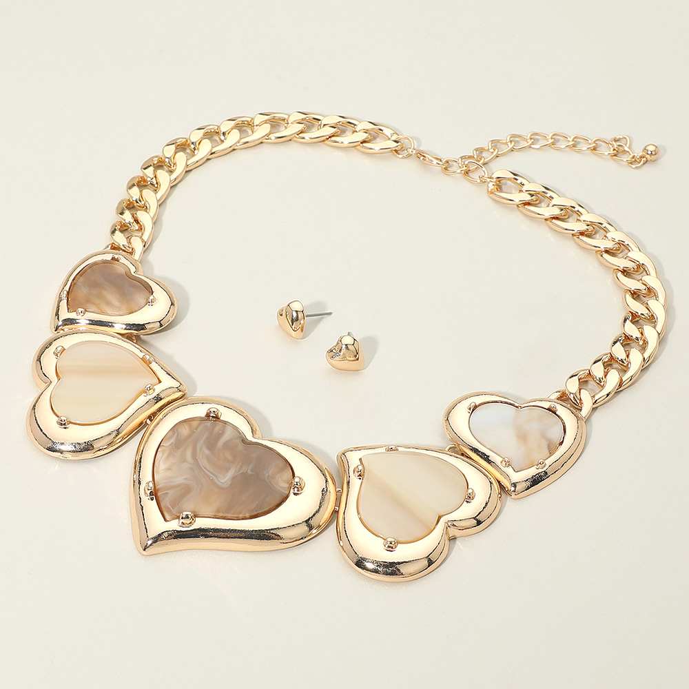Details • Necklace Size : 17" + 3" L • Decor Size : 2" L • Earrings Size : 0.4" L • This bold heart statement necklace and stud earring set features oversized heart accents paired with a sleek chain silhouette for high visual impact. Designed for trend-driven styling, it is perfect for boutiques, gifting moments, and statement looks that stand out in everyday wear or special occasions. • Lead and Nickel Compliant