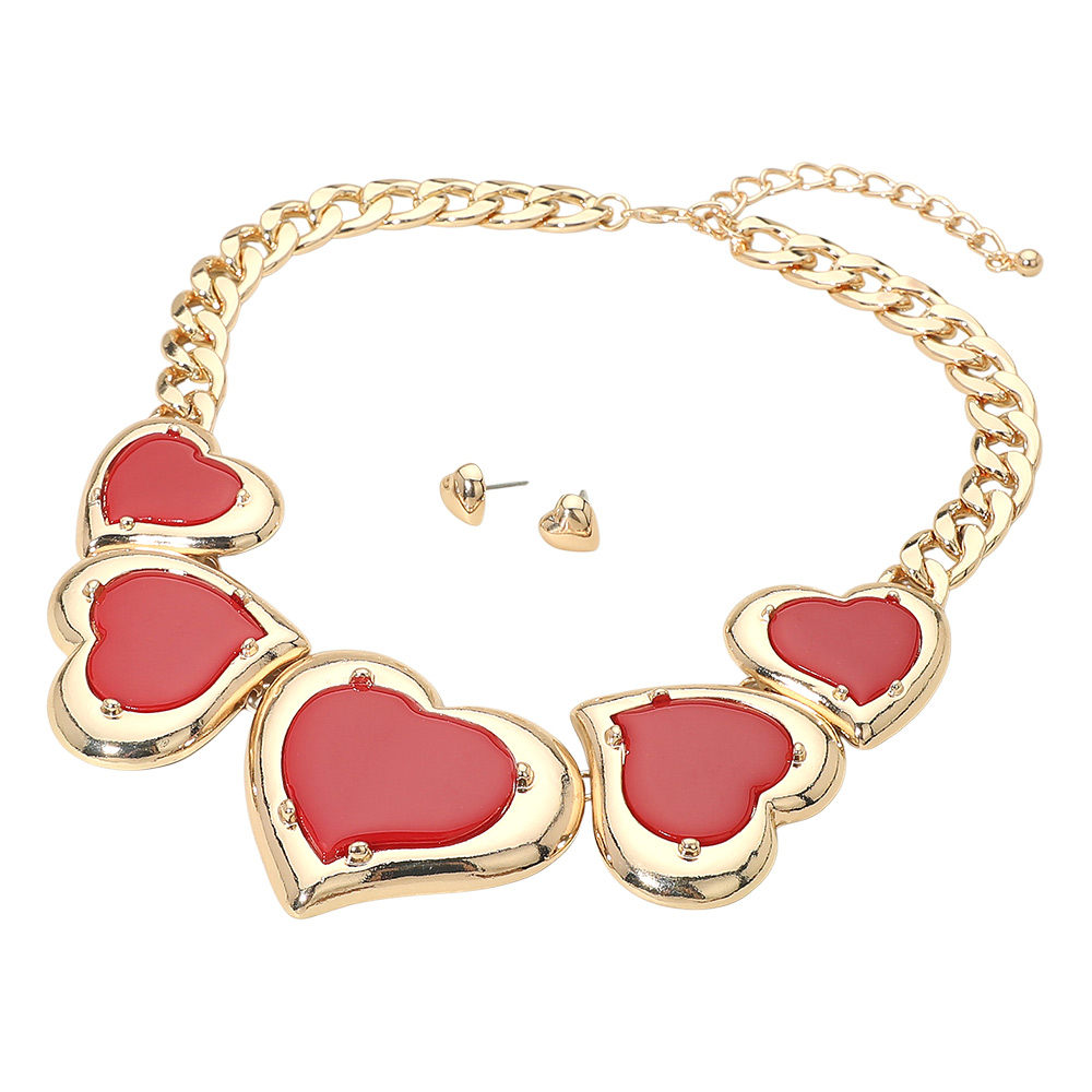 • This bold heart statement necklace and stud earring set features oversized heart accents paired with a sleek chain silhouette for high visual impact. Designed for trend-driven styling, it is perfect for boutiques, gifting moments, and statement looks that stand out in everyday wear or special occasions.