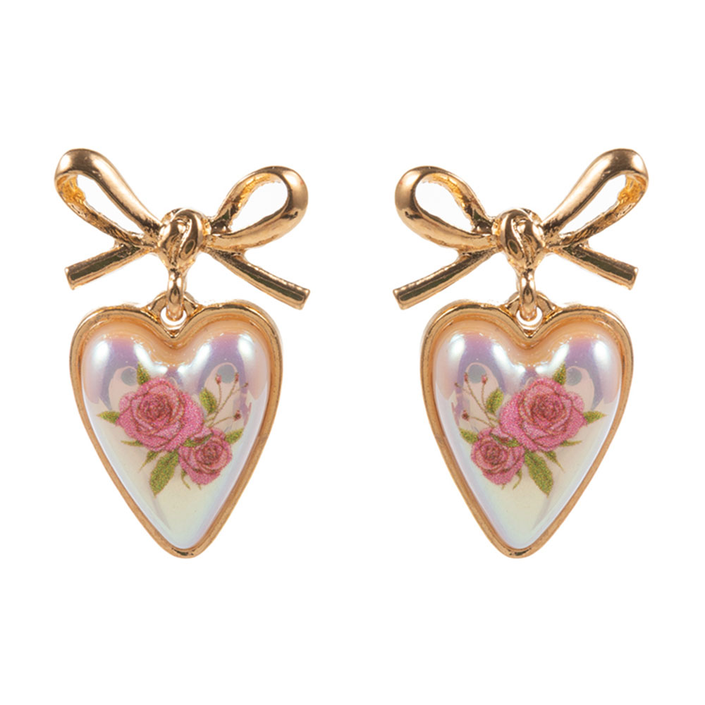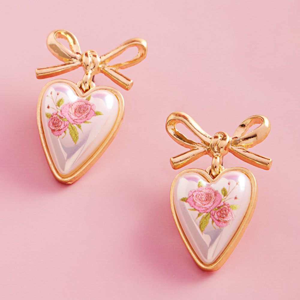 Details • Size : 0.8" X 1.25" • Titanium Post Back • These floral heart drop earrings feature a romantic heart shape paired with an elegant bow accent and a soft printed motif. Designed to add charm and femininity to any look, they are ideal for gifting, boutique jewelry collections, and everyday styling with a graceful, eye-catching finish. • Hypoallergenic • Lead and Nickel Compliant