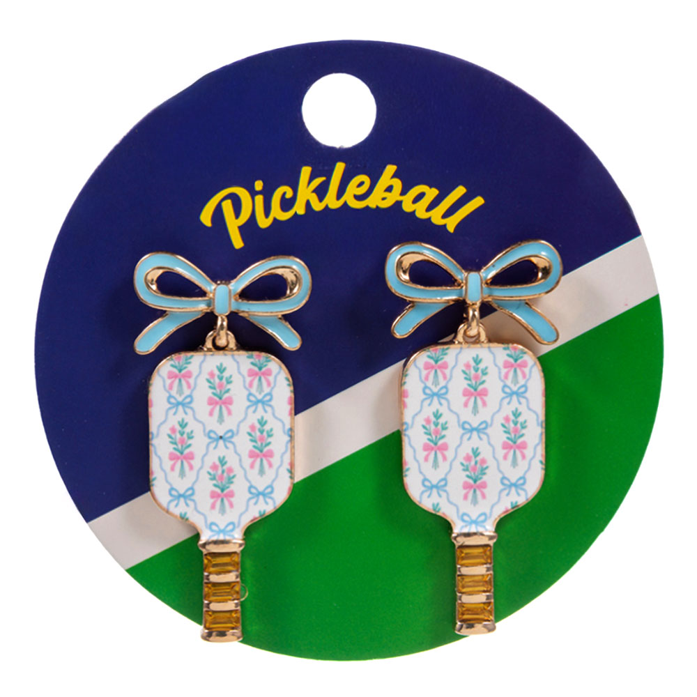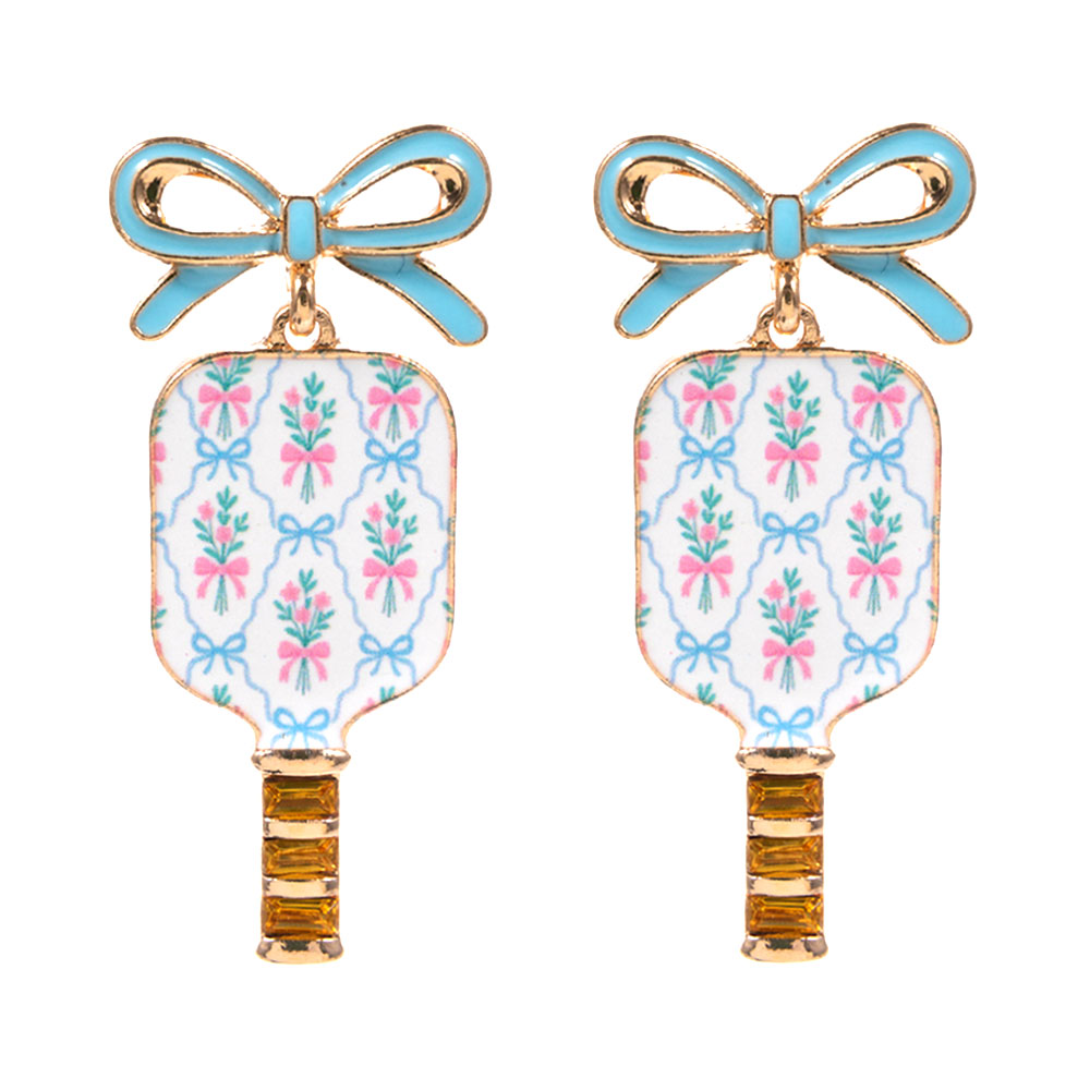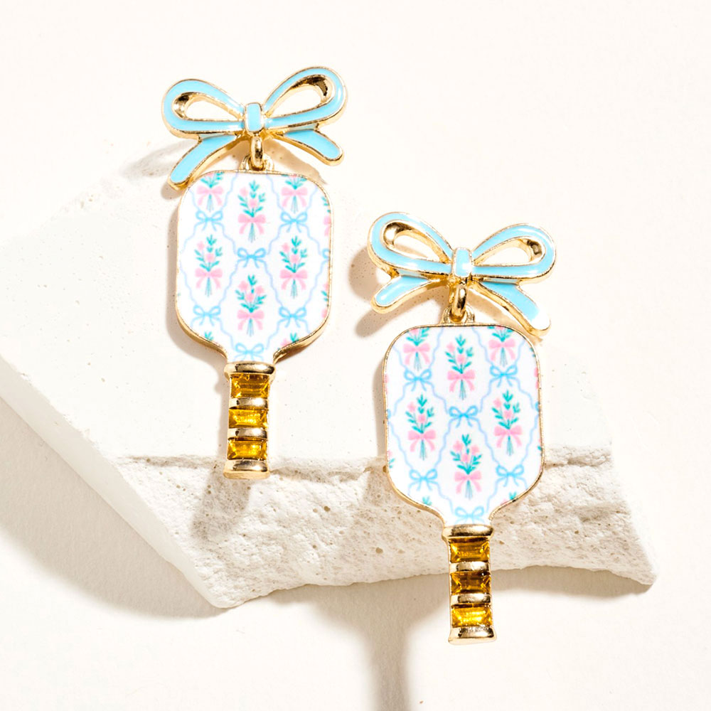 Details • Size : 0.8" X 1.75" • Post Back • These pickleball paddle drop earrings feature a charming bow accent and playful patterned design, adding a fun and sporty touch to any outfit. Perfect for everyday wear, gifting, or pickleball lovers, they bring personality and style to casual looks while remaining lightweight and easy to pair with seasonal accessories. • Lead and Nickel Compliant