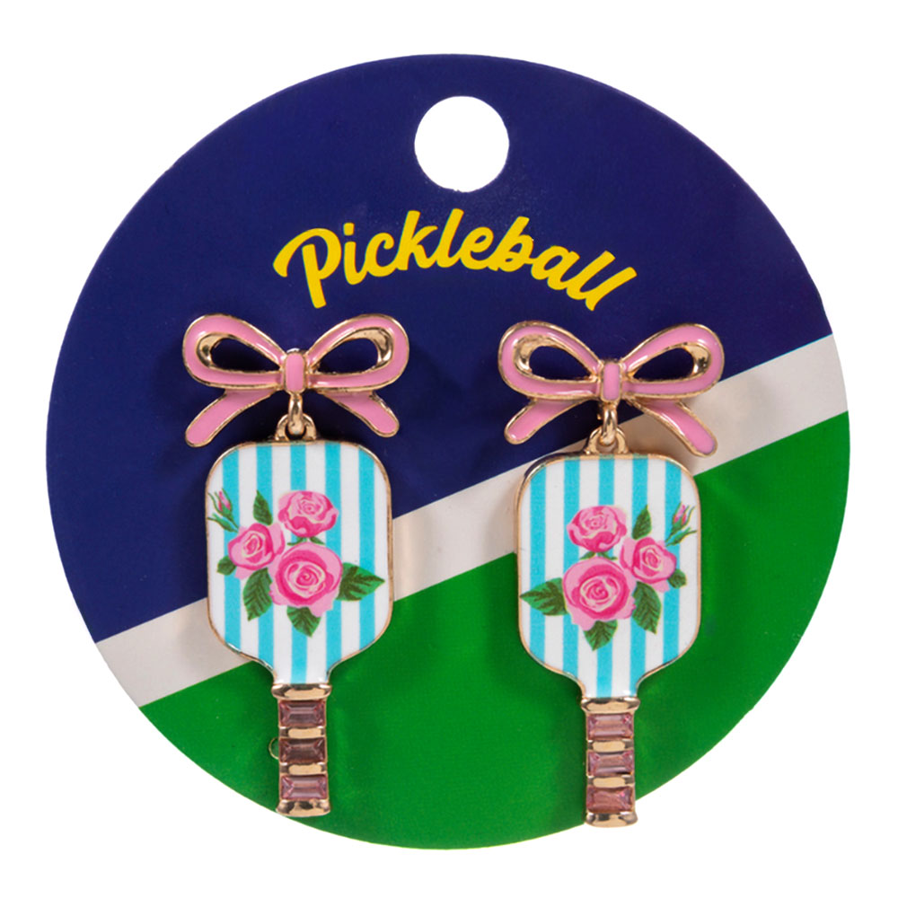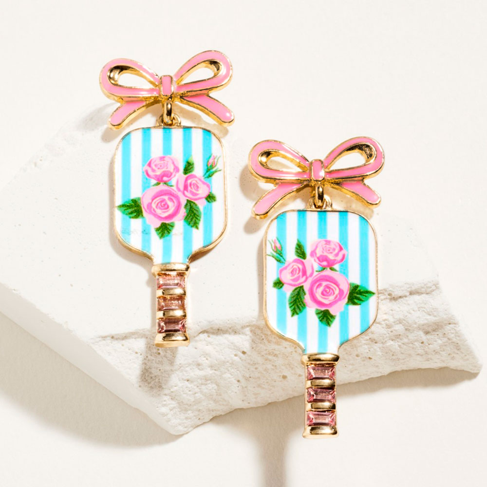 Details • Size : 0.8" X 1.75" • Post Back • These pickleball paddle drop earrings feature a charming bow accent and playful patterned design, adding a fun and sporty touch to any outfit. Perfect for everyday wear, gifting, or pickleball lovers, they bring personality and style to casual looks while remaining lightweight and easy to pair with seasonal accessories. • Lead and Nickel Compliant