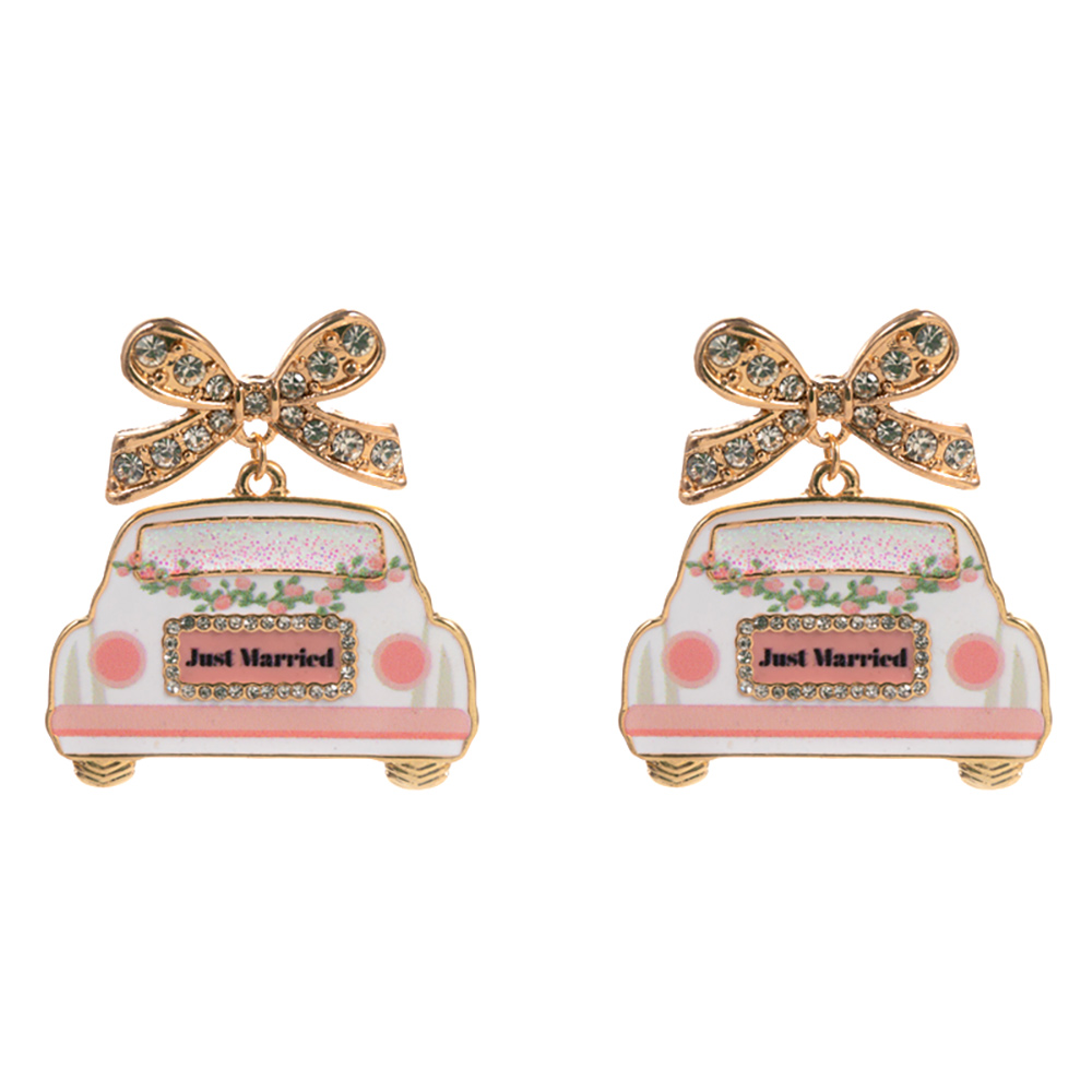 Details • Size : 1.25" X 1.5" • Post Back • These novelty drop earrings feature a charming car design with a bow accent and “Just Married” message for a playful, celebration-ready look. Designed with eye-catching movement and whimsical detail, they are perfect for bridal events, bachelorette parties, wedding gifts, or themed collections. A fun statement accessory that adds personality and joy to special occasion outfits. • Hypoallergenic • Lead and Nickel Compliant
