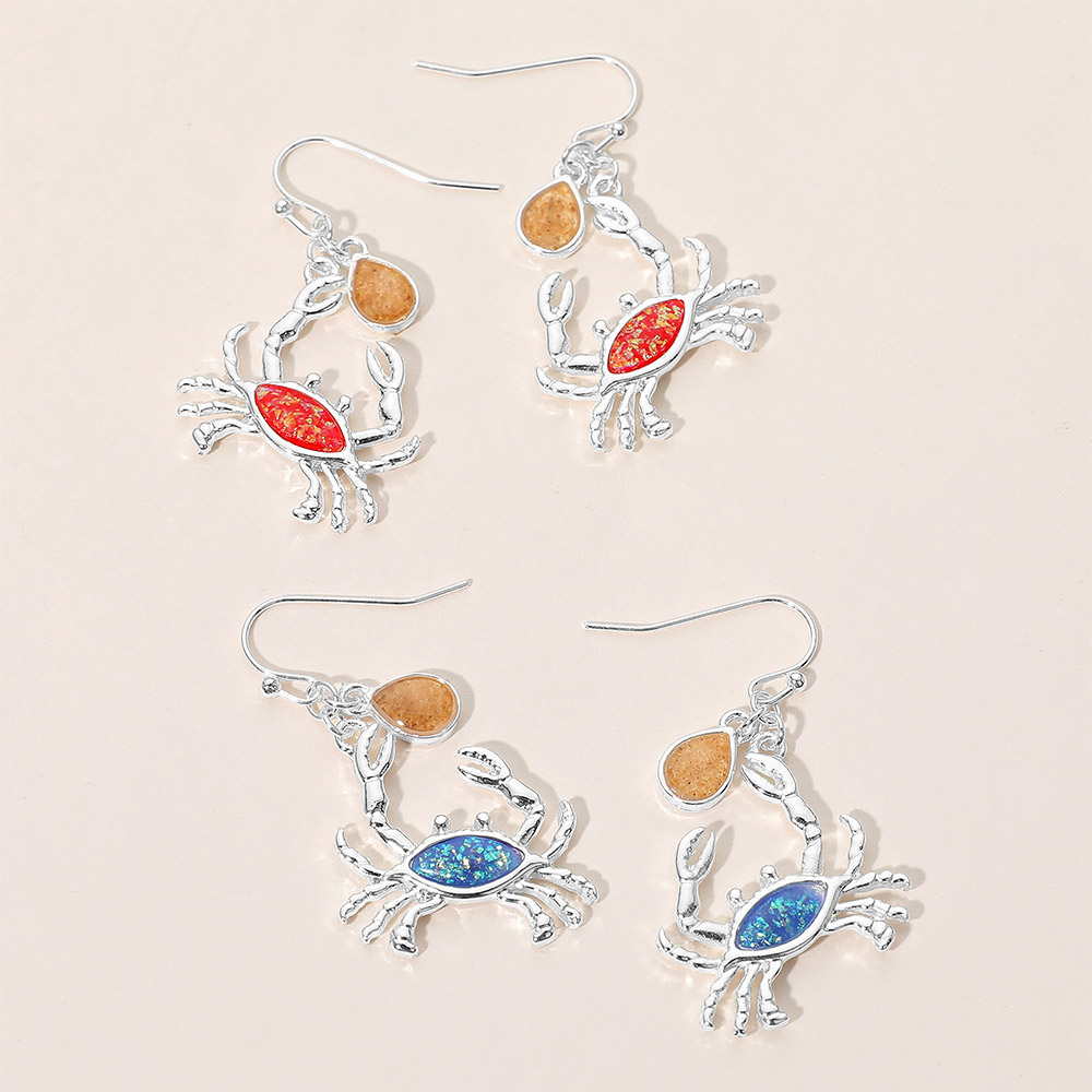 • Whimsical crab charm dangle earrings designed with playful seaside details for beach and coastal inspired collections. A fun statement accessory ideal for summer outfits, resort wear, vacations, and ocean themed displays, offering eye catching movement and seasonal appeal for retail assortments.