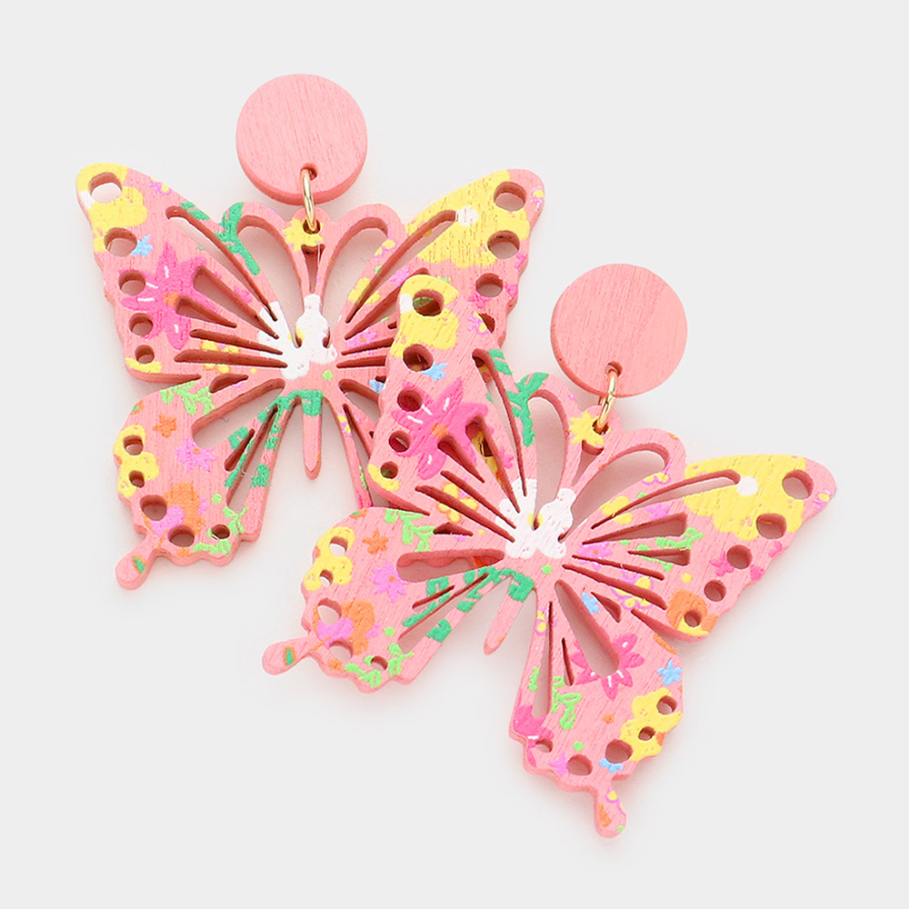 Cut Out Painted Wood Butterfly Dangle Earrings