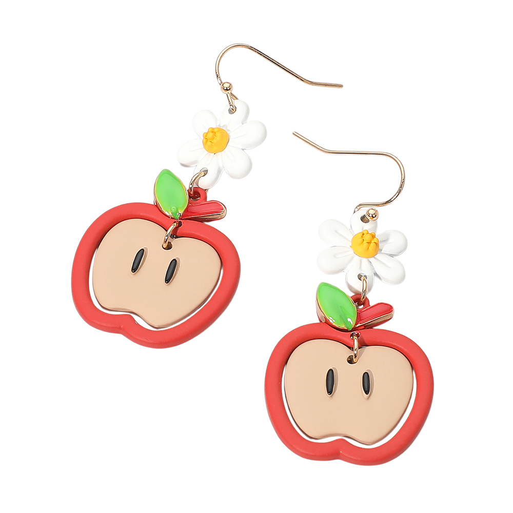 Details • Size : 1" X 2" • Fish Hook Back • Adorable apple slice drop earrings accented with a daisy charm for a fun, cheerful look. Lightweight and eye-catching, these playful earrings add a sweet touch to everyday outfits and themed occasions. A charming accessory perfect for gifting or completing a cute, whimsical style. • Lead and Nickel Compliant