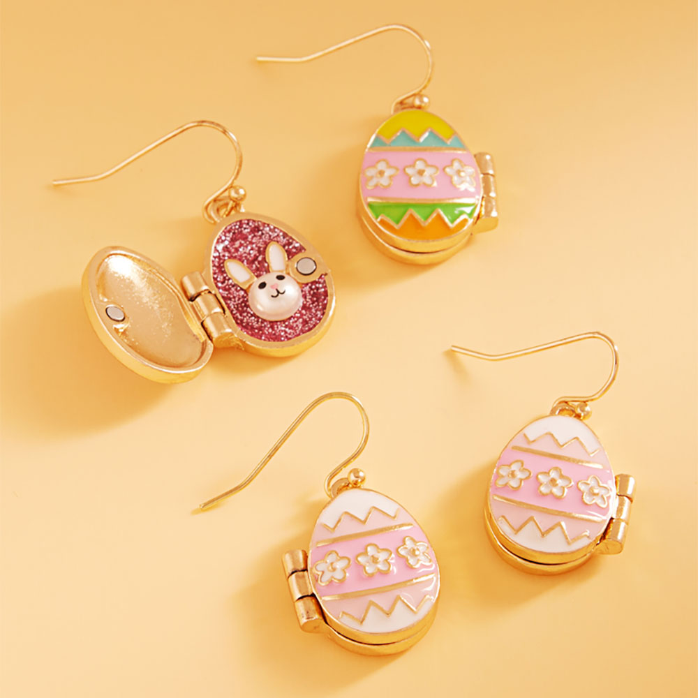 Details • Size : 0.7" X 1" • Brass Fish Hook Back • Easter egg locket drop earrings featuring a playful hinged design with charming seasonal details. This whimsical style opens to reveal a fun surprise, making it a standout accessory for spring collections. Ideal for boutiques, gift shops, and holiday-themed assortments looking to add novelty earrings with eye-catching movement, cheerful character appeal, and strong gifting potential. • Lead and Nickel Compliant