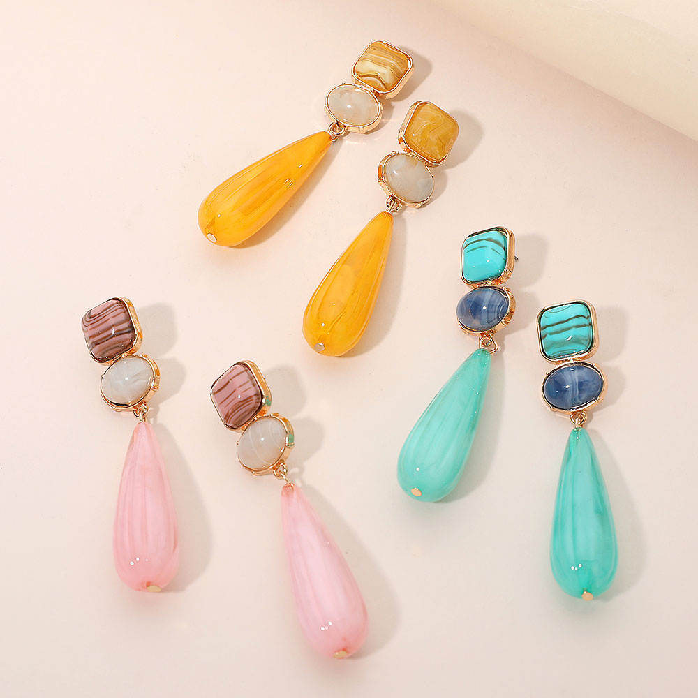 Details • Size : 0.6" X 3" • Post Back • These elegant teardrop dangle earrings feature smooth, marbled drops paired with chic geometric accents. Perfect for adding refined sophistication to both casual and formal looks, they bring a graceful balance of modern style and timeless feminine charm. • Lead and Nickel Compliant
