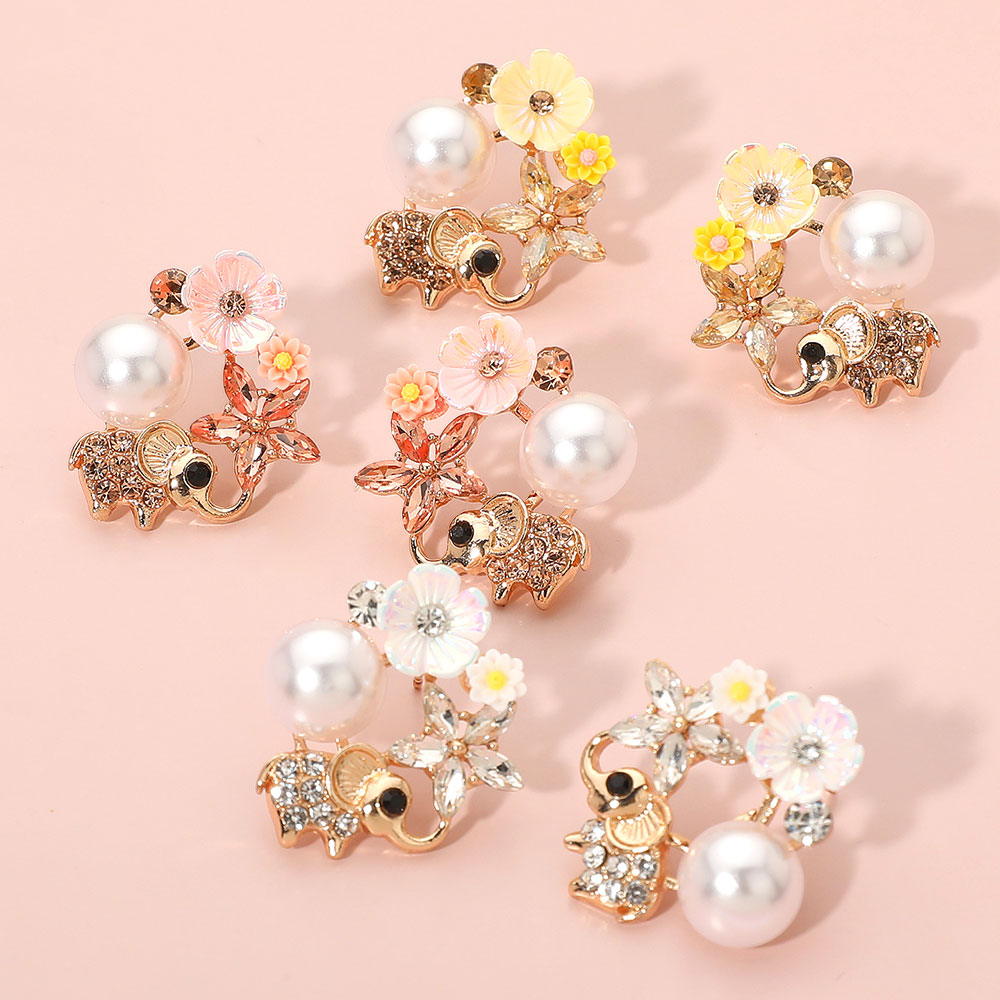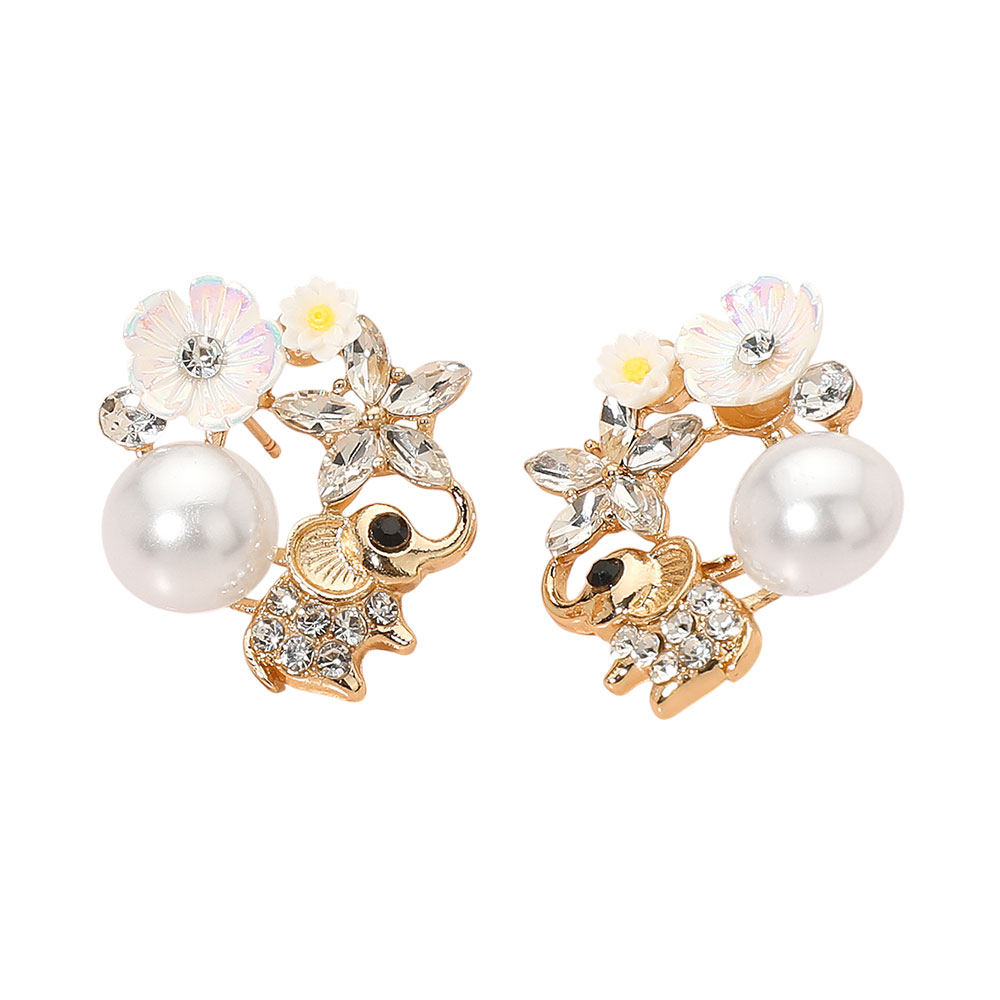 Details • Size : 1.25" X 1.25" • Post Back • Whimsical stud earrings featuring adorable elephant charms adorned with crystals, delicate floral details, and luminous pearl accents. A charming accessory that blends playful design with elegant sparkle, perfect for adding personality to casual or dressy looks. • Lead and Nickel Compliant