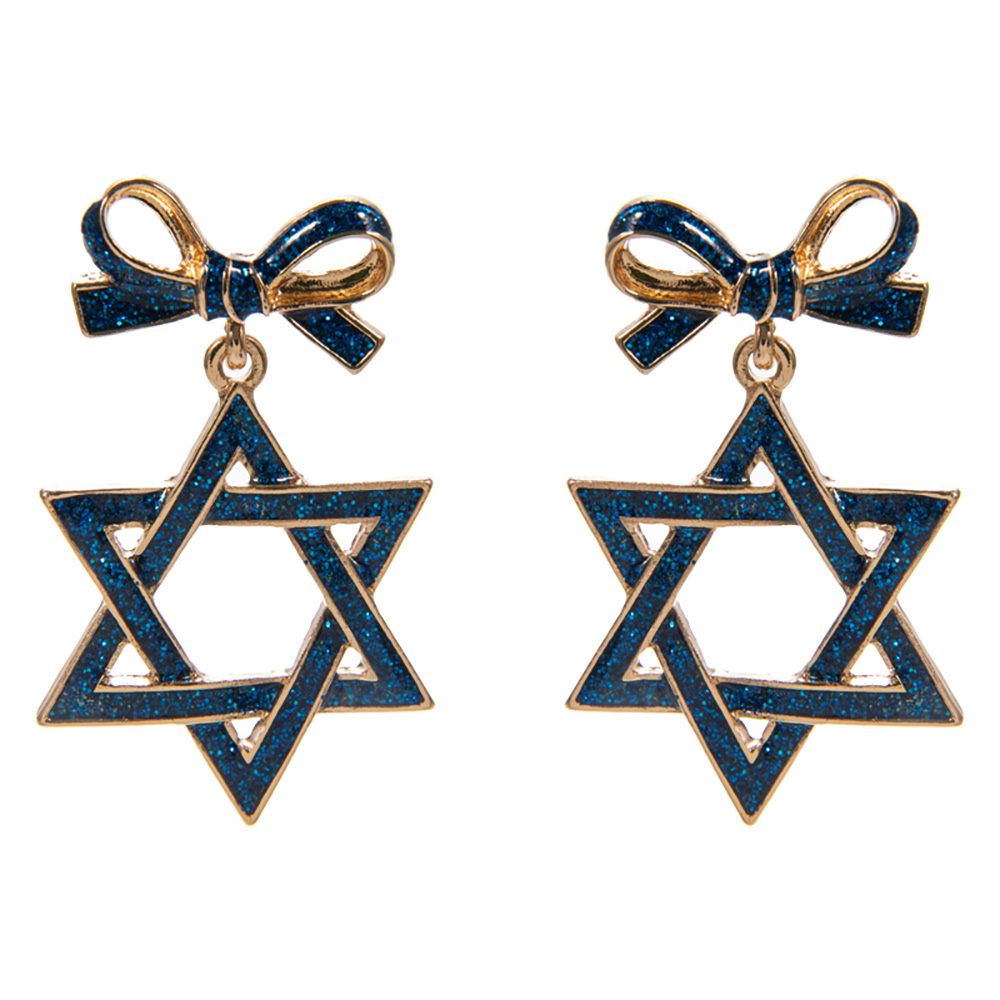 • Add charm and tradition to your look with these Star of David dangle earrings featuring sparkling bow accents. A meaningful accessory perfect for holidays, festive occasions, or daily wear, combining cultural symbolism with playful, elegant style.