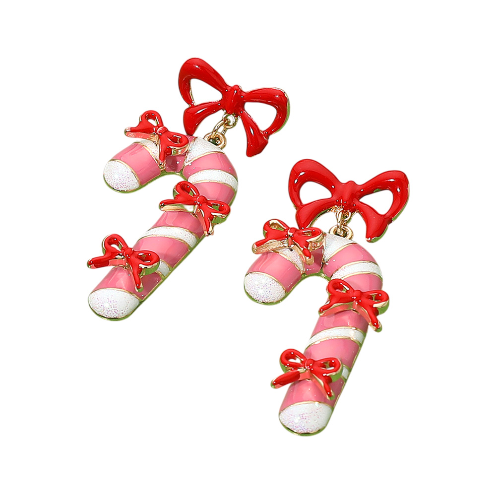 Details • Size : 0.8" X 2" • Post Back • Bring holiday cheer to your outfit with these candy cane bow earrings featuring striped detailing and charming bow accents. A fun and festive accessory, perfect for Christmas parties, seasonal gatherings, and adding a playful touch to your winter style. • Lead and Nickel Compliant