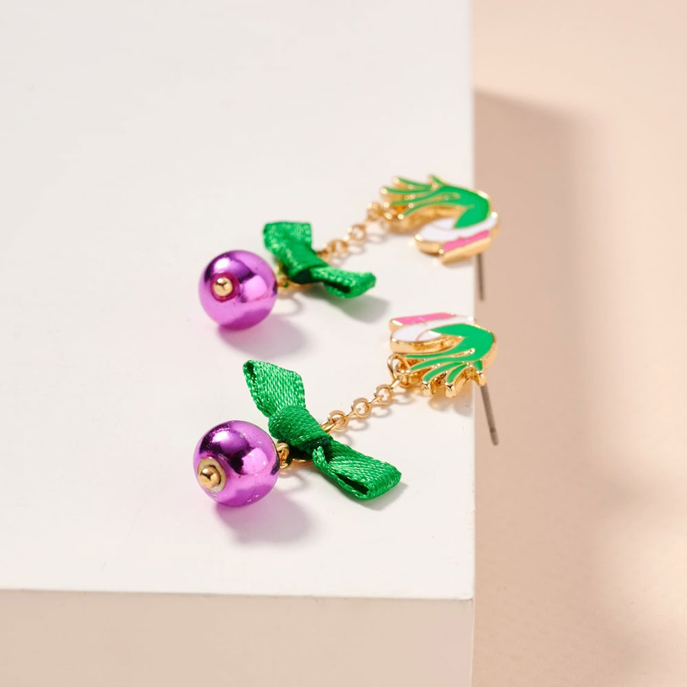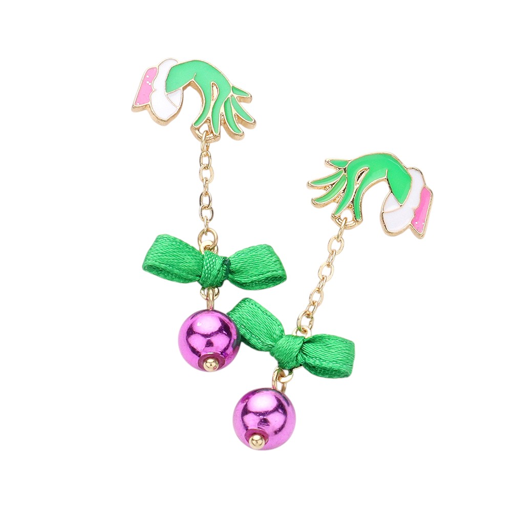 Enamel Grinch Hand Bow Bell Dropdown Earrings