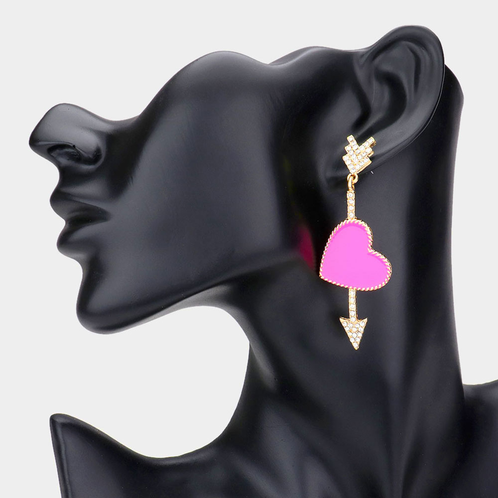 Enamel Heart Accented Rhinestone Embellished Arrow Dangle Earrings