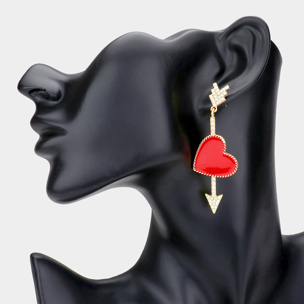 Enamel Heart Accented Rhinestone Embellished Arrow Dangle Earrings