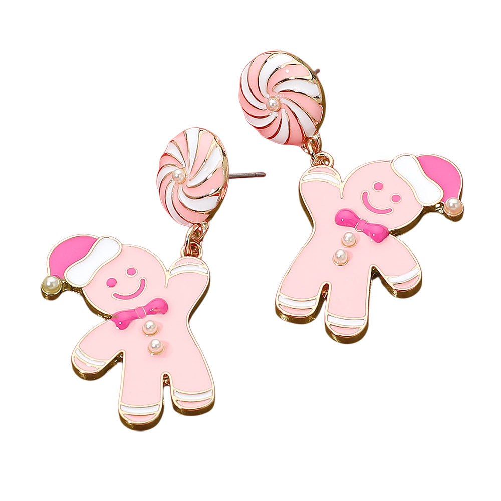 Details • Size : 1.25" X 2" • Post Back • Add a playful holiday touch with these charming gingerbread man earrings, featuring a cheerful design with candy-inspired details. Perfect for festive parties or seasonal gifting, they bring joyful character and sparkle to your Christmas style. • Lead and Nickel Compliant
