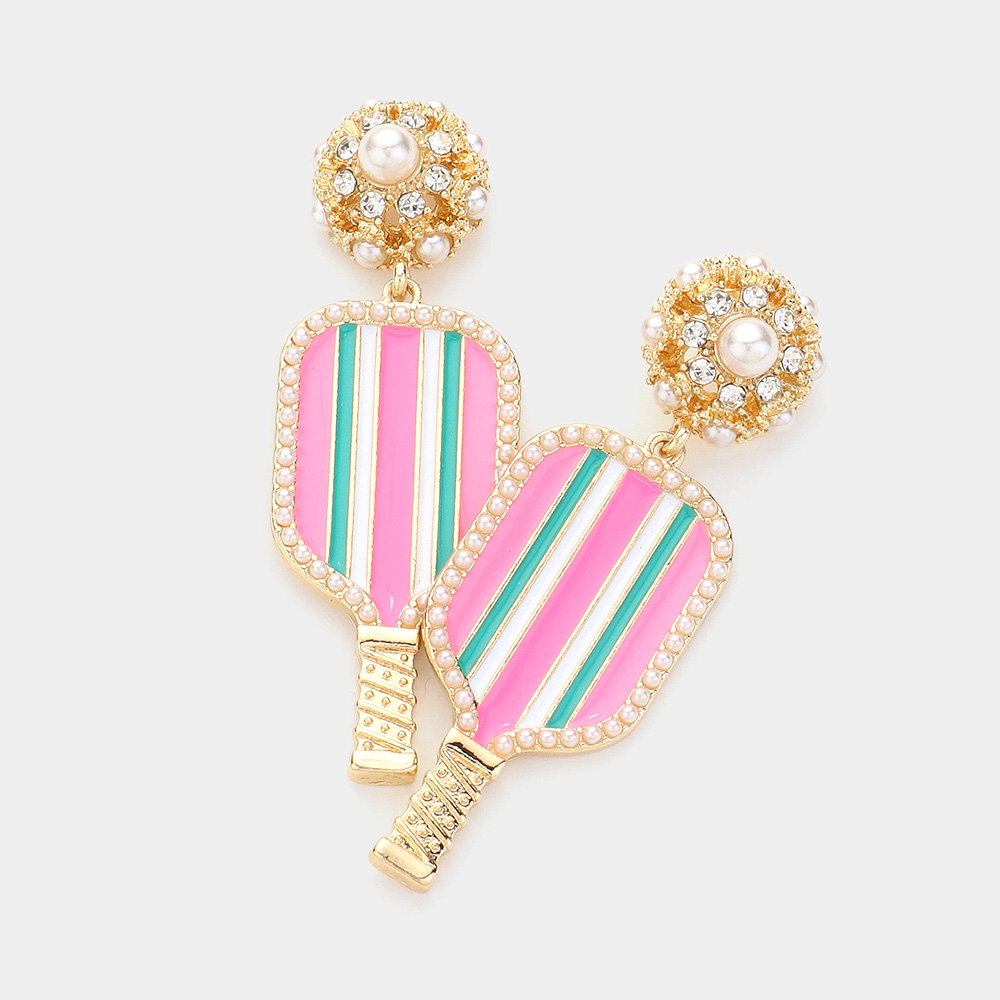 Enamel Stone Embellished Pickleball Paddle Dangle Earrings