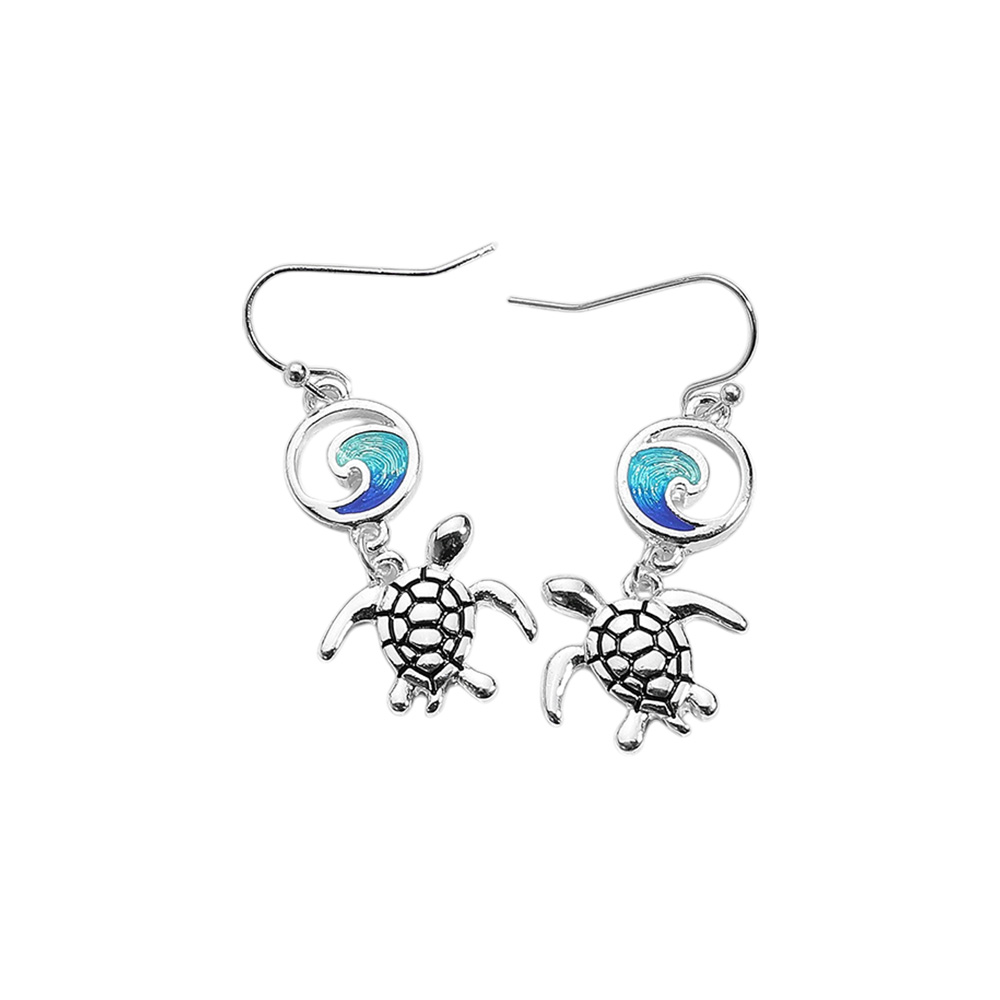 Enamel Wave Antique Metal Sea Turtle Link Dangle Earrings