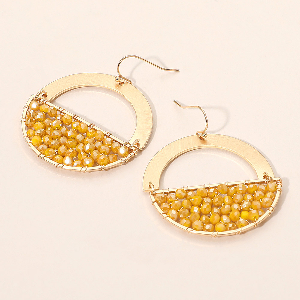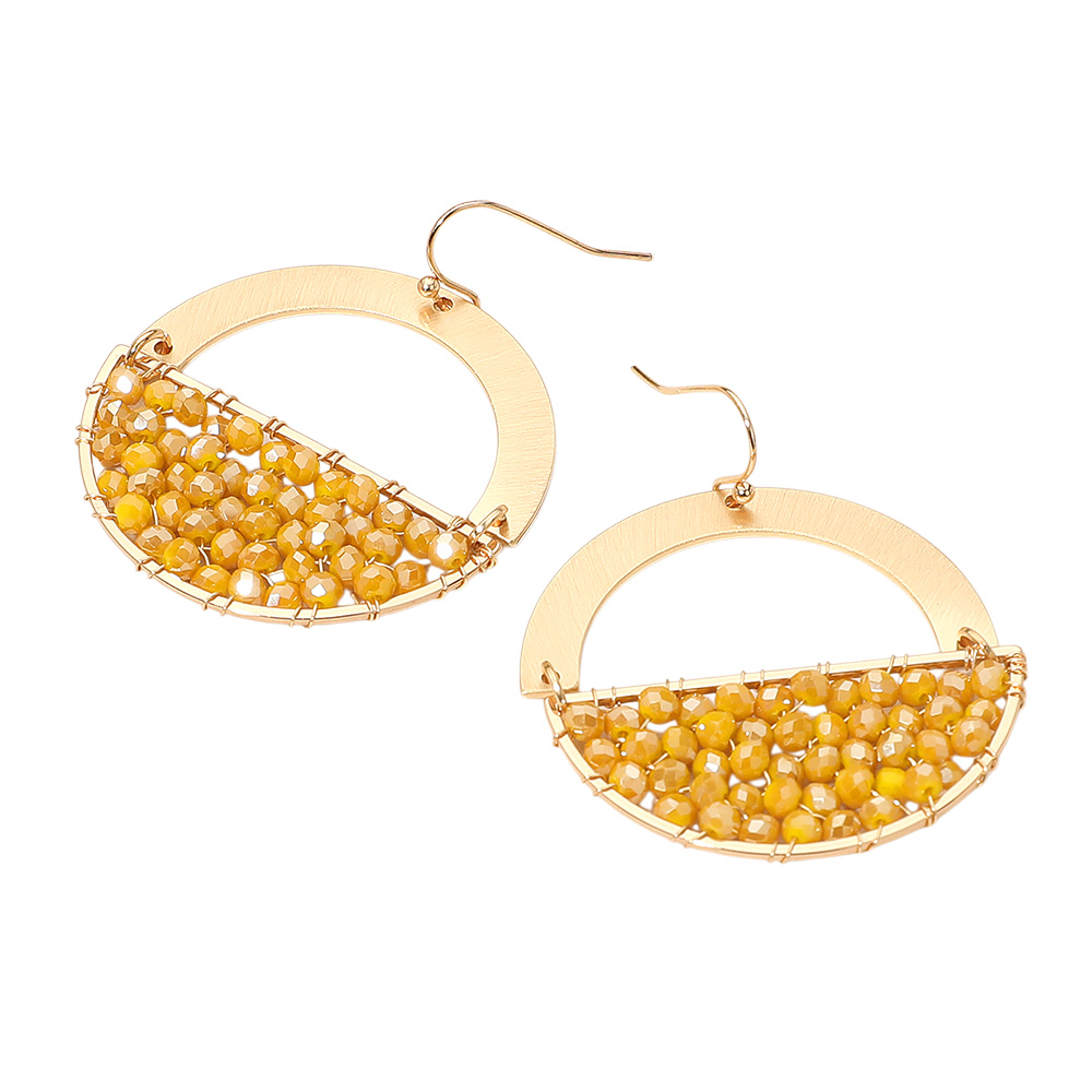 Details • Size : 1.6" X 2" • Fish Hook Back • Stand out with half-circle beaded dangle earrings featuring a chic geometric frame and sparkling bead accents. Lightweight and stylish, these earrings add a trendy statement to any outfit, perfect for both casual looks and evening wear. • Lead and Nickel Compliant