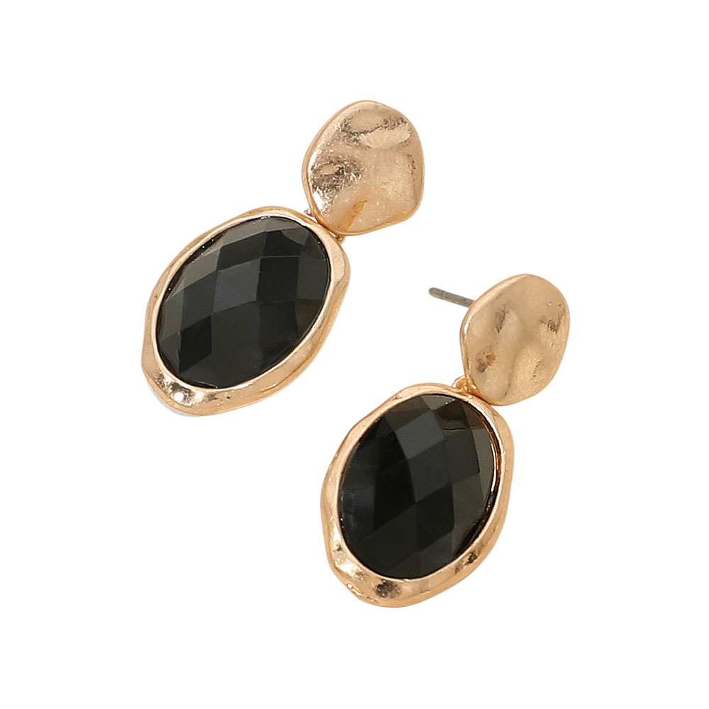 Details • Size : 0.5" X 1.2" • Post Back • These faceted oval drop earrings feature a striking gemstone-inspired center set within an organic, sculpted metallic frame. Versatile and lightweight, they add polished sophistication to everyday outfits or evening looks, making them a standout accessory for modern, elegant style. • Lead and Nickel Compliant