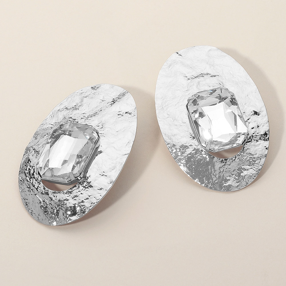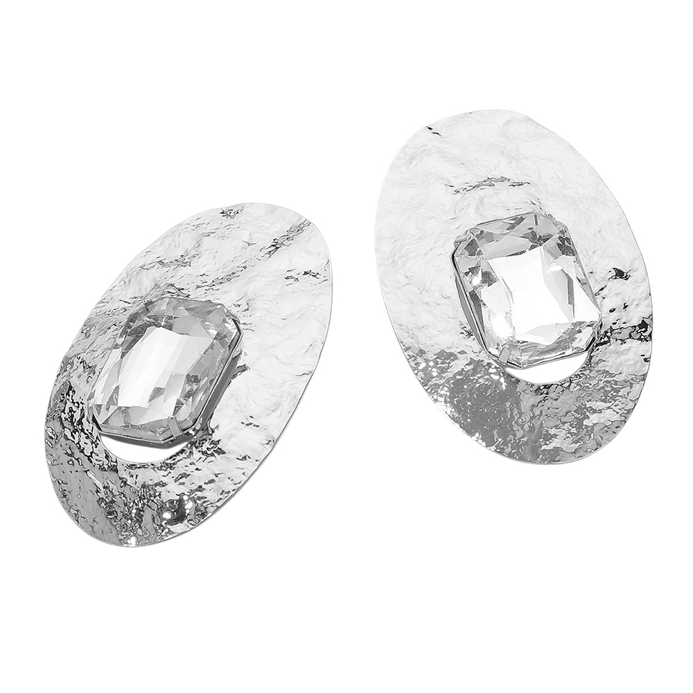 Details • Size : 1.6" X 2.5" • Post Back • Discover textured oval earrings with a faceted centerpiece that adds eye-catching brilliance. Their organic design and artistic flair create a bold statement, perfect for elevating everyday outfits or complementing evening looks with modern sophistication. • Lead and Nickel Compliant
