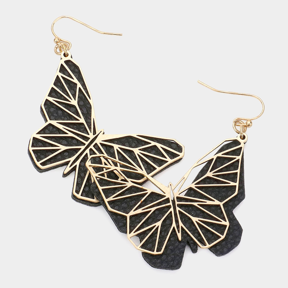Faux Leather Back Metal Laser Cut Butterfly Dangle Earrings
