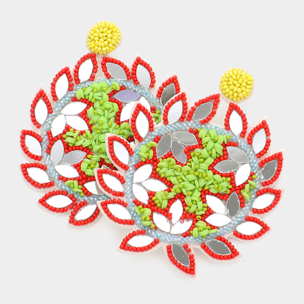 Faux Leather Back Mirror Beaded Floral Dangle Earrings