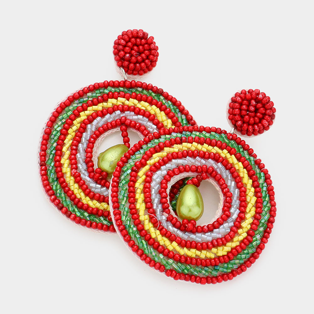 Faux Leather Back Pearl Centered Beaded Open Circle Dangle Earrings