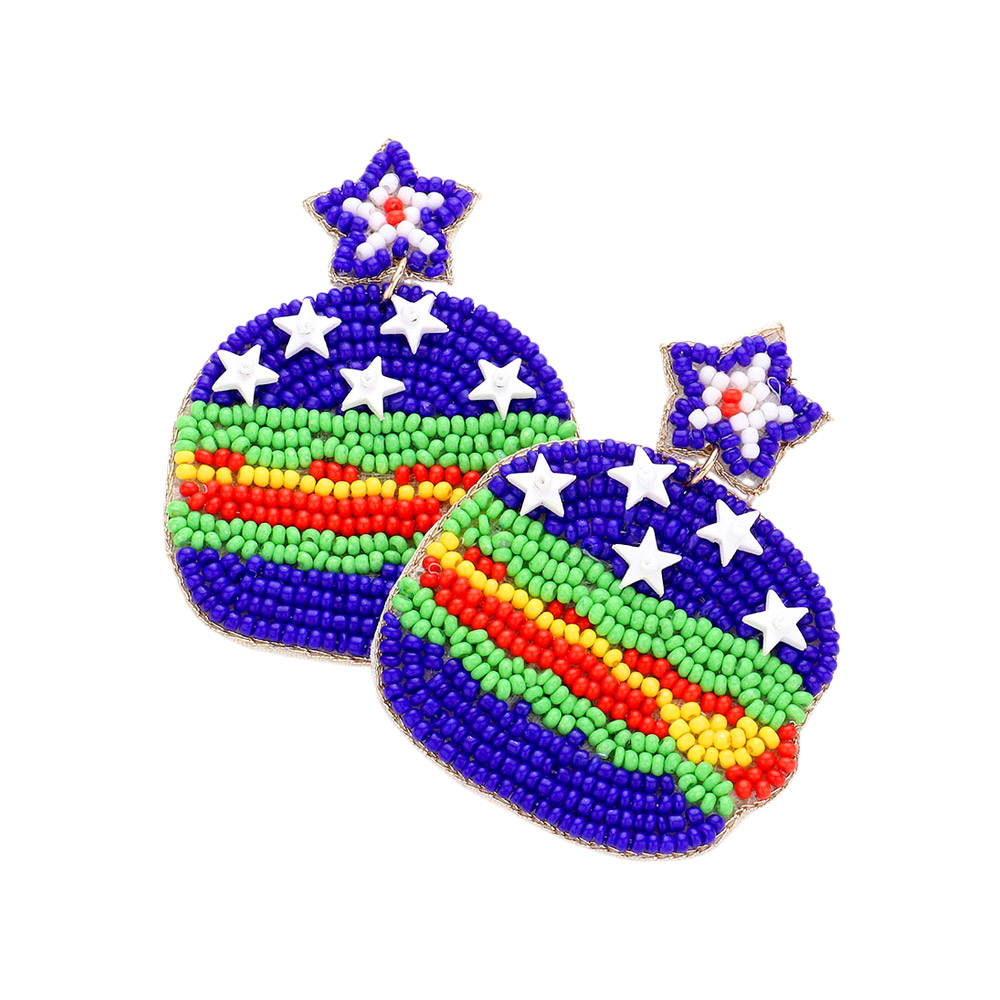 Felt Back American USA Flag Seed Beaded Star Hamburger Link Dangle Earrings