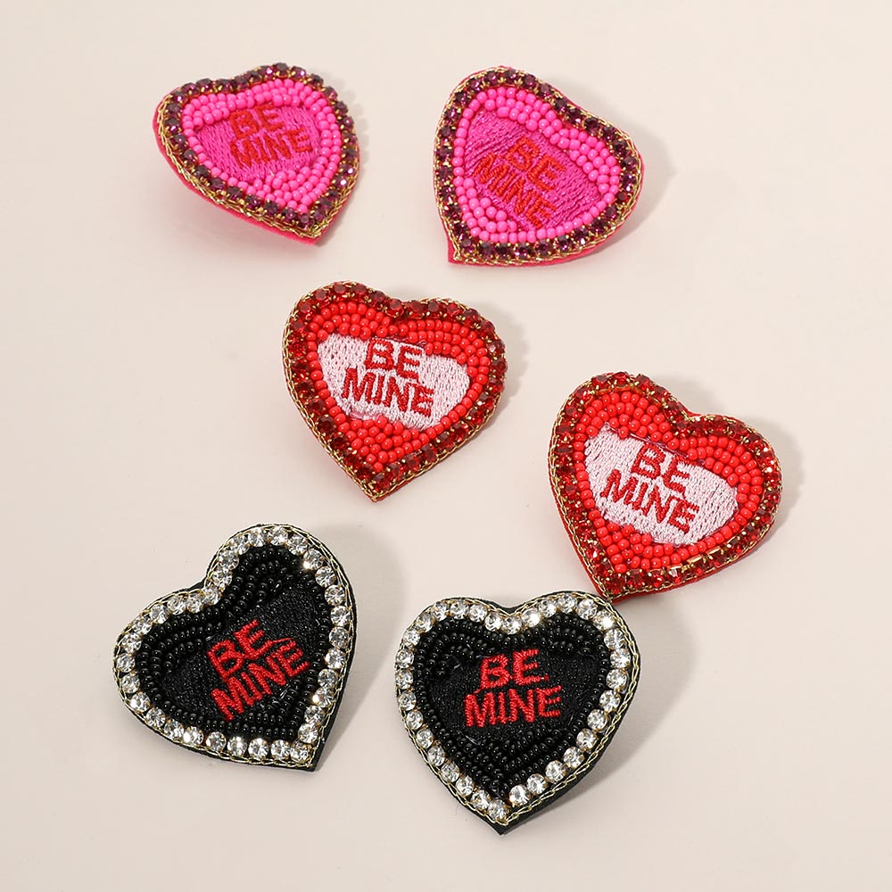 Felt Back BE MINE Message Embroidered Seed Bead Stone Embellished Earrings