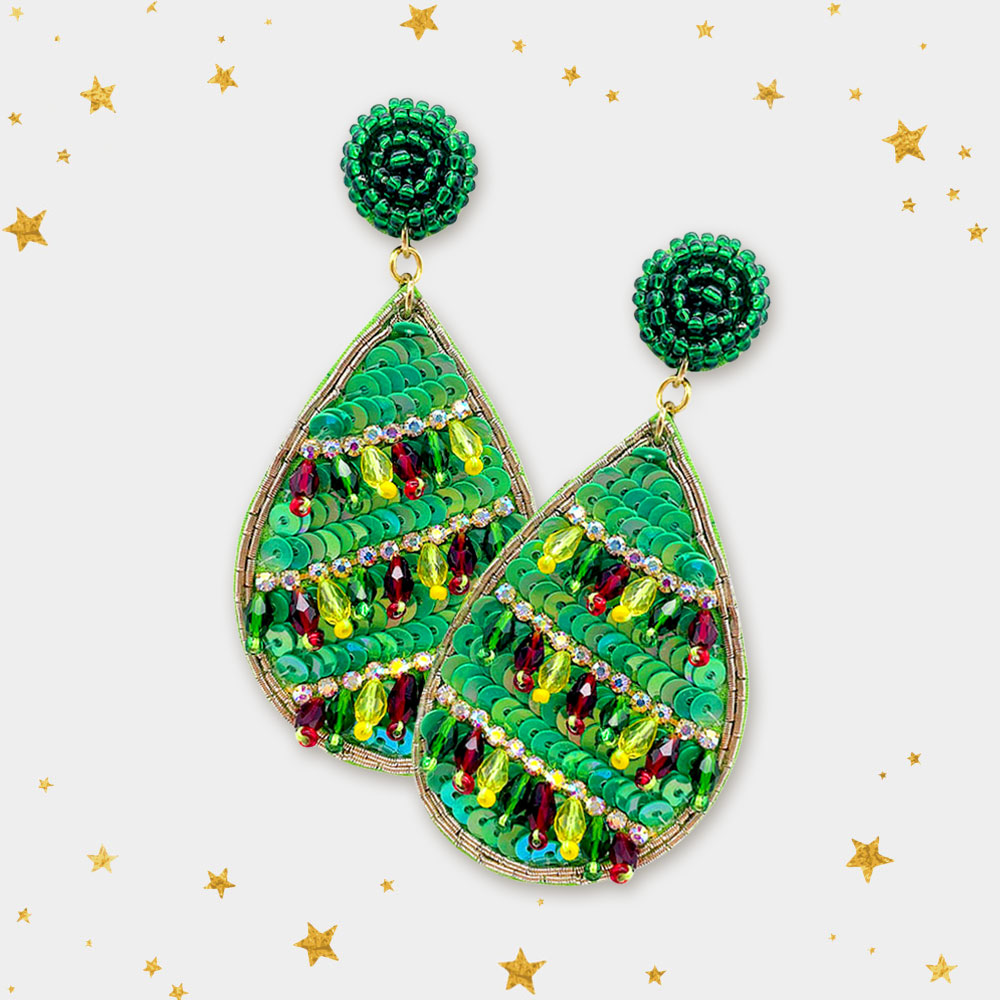 • Statement teardrop earrings with festive beaded stripes and sequin accents. A bold holiday accessory that adds sparkle and cheer to your Christmas party look.