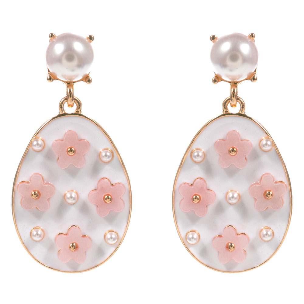 • These floral easter egg drop earrings feature a playful oval silhouette accented with delicate flower details and subtle bead elements. Designed to bring a whimsical yet elegant touch to seasonal outfits, they are ideal for spring styling, gift displays, and boutique accessory collections seeking charming statement pieces.