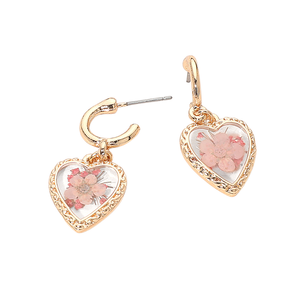 Details • Size : 0.6" X 1.3" • Fish Hook Back • Charming heart-shaped drop earrings designed to showcase a delicate, botanical-inspired centerpiece within a sleek, modern silhouette. Lightweight and easy to style, they add a romantic accent to everyday outfits while transitioning effortlessly into polished looks for evenings or special occasions. • Lead and Nickel Compliant