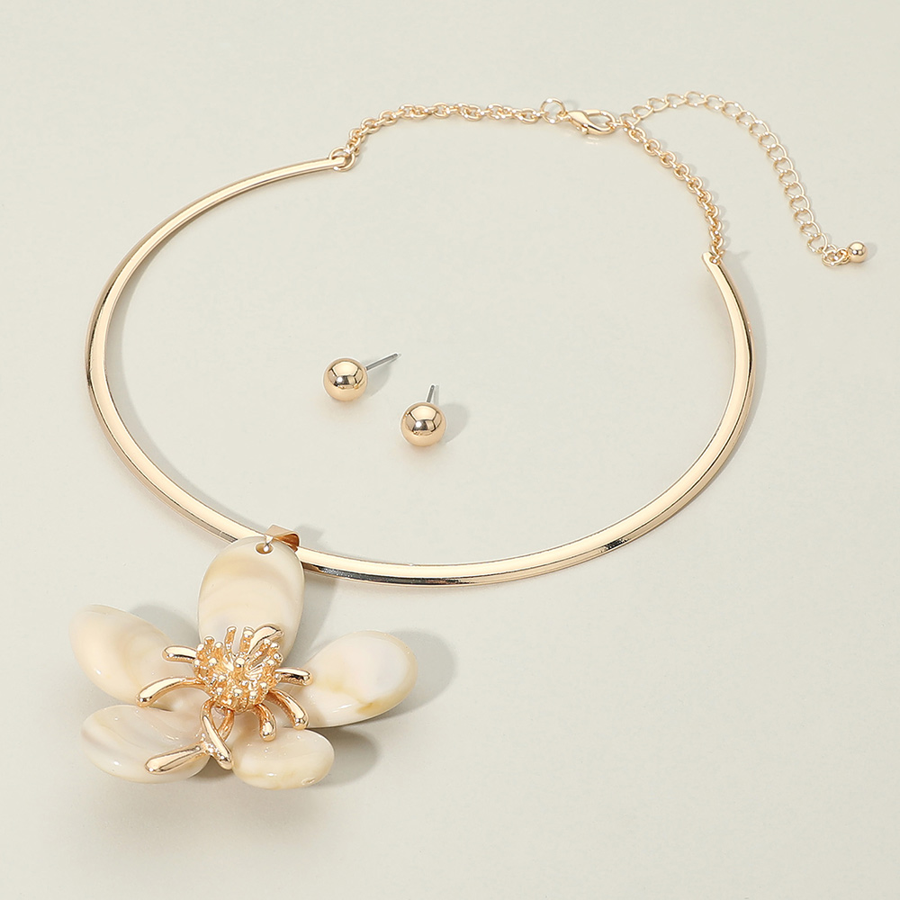 • This floral statement collar necklace and stud earring set features a sleek curved silhouette accented with a bold flower centerpiece for modern elegance. Designed to elevate boutique assortments, it is ideal for statement styling, gifting, and fashion-forward looks that transition easily from day to night.