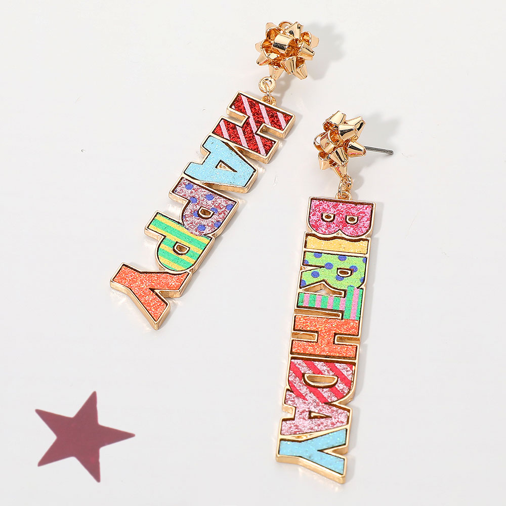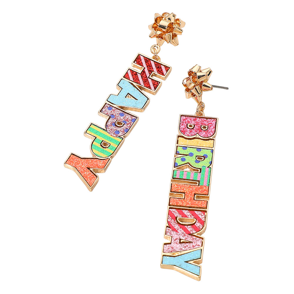 Details • Size : 0.5" X 3", 0.5" X 3.2" • Post Back • Bold vertical statement earrings spelling “Birthday” with playful textured detailing and sparkling accents. Designed to stand out at parties, celebrations, photoshoots, and festive events while adding a cheerful twist to everyday accessory styling. • Lead and Nickel Compliant