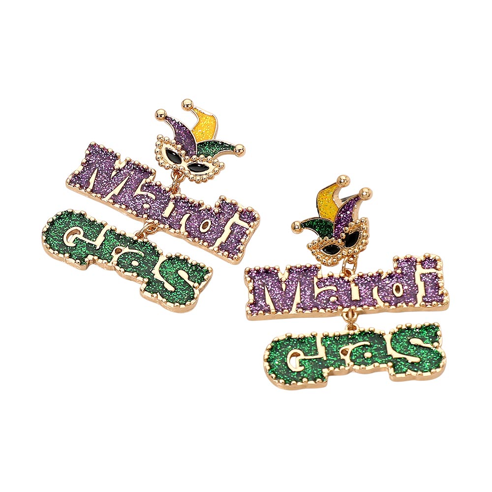 Details • Size : 1.5" X 1.75" • Post Back • Festive Mardi Gras statement drop earrings featuring playful masquerade mask accents and bold letter charms with lively movement. Designed for parades, parties, and themed celebrations, these eye-catching earrings add fun personality, dramatic flair, and standout appeal to Mardi Gras outfits and party looks. • Lead and Nickel Compliant
