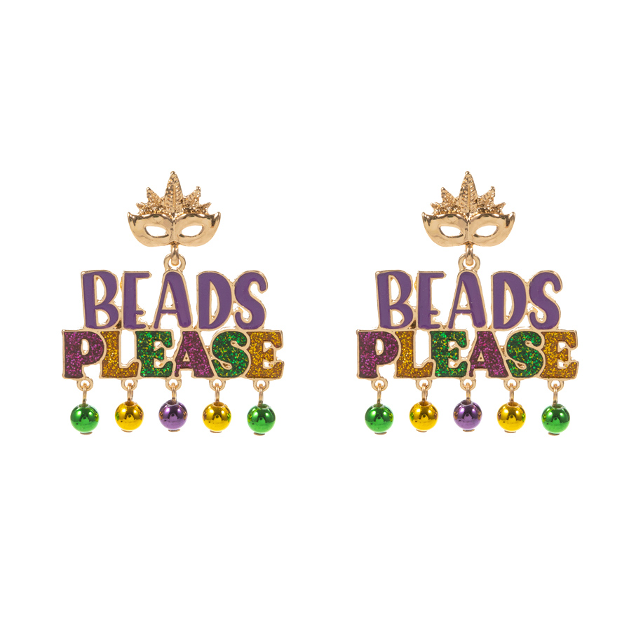 Details • Size : 1.5" X 1.75" • Titanium Post Back • Bold “Beads Please” statement earrings perfect for festival outfits, parade celebrations, and party looks. Fun and festive accessory to make your costume stand out and bring playful charm to any celebration. • Lead and Nickel Compliant • Hypoallergenic