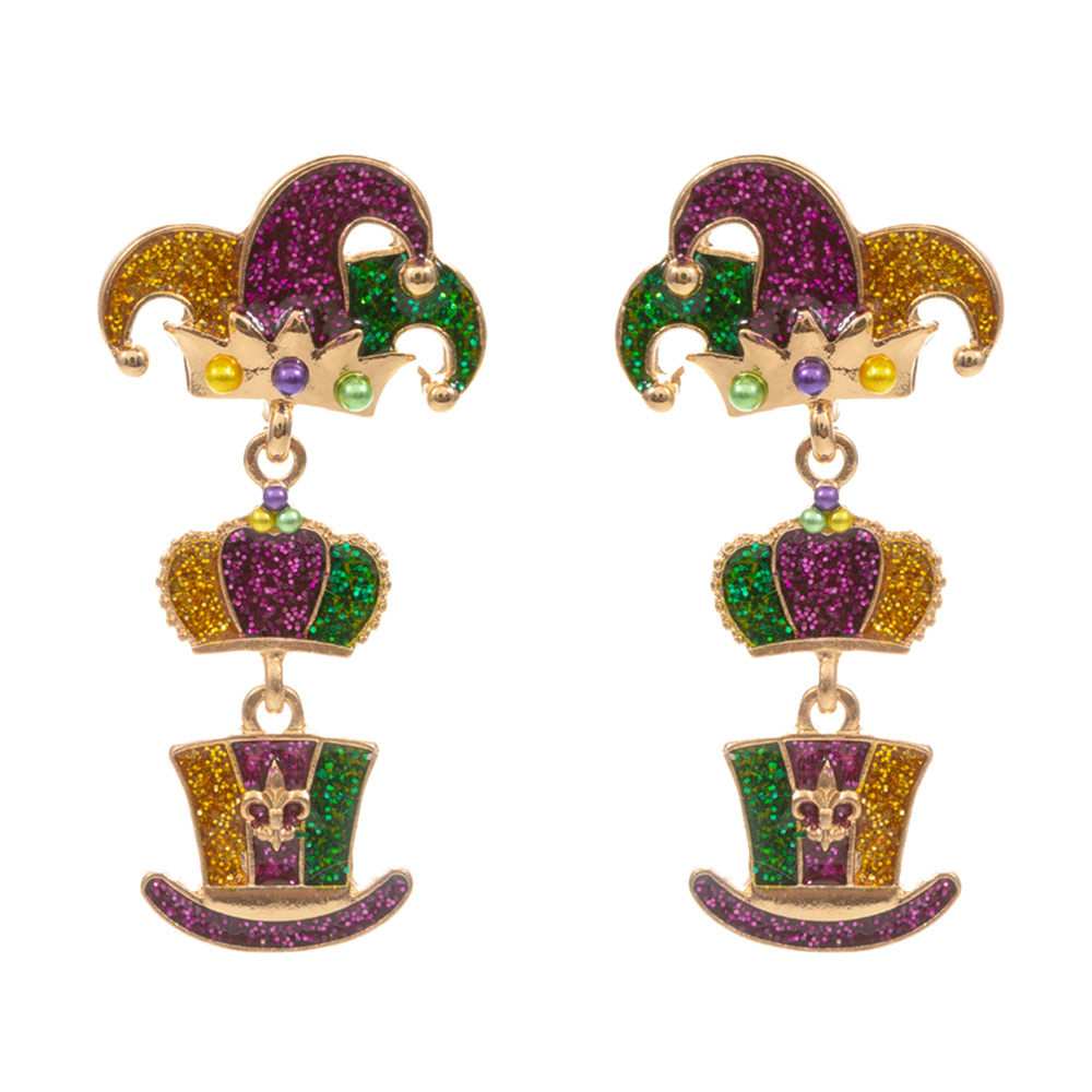 Glittered Enamel Mardi Gras Jester Hat Link Dropdown Dangle Earrings