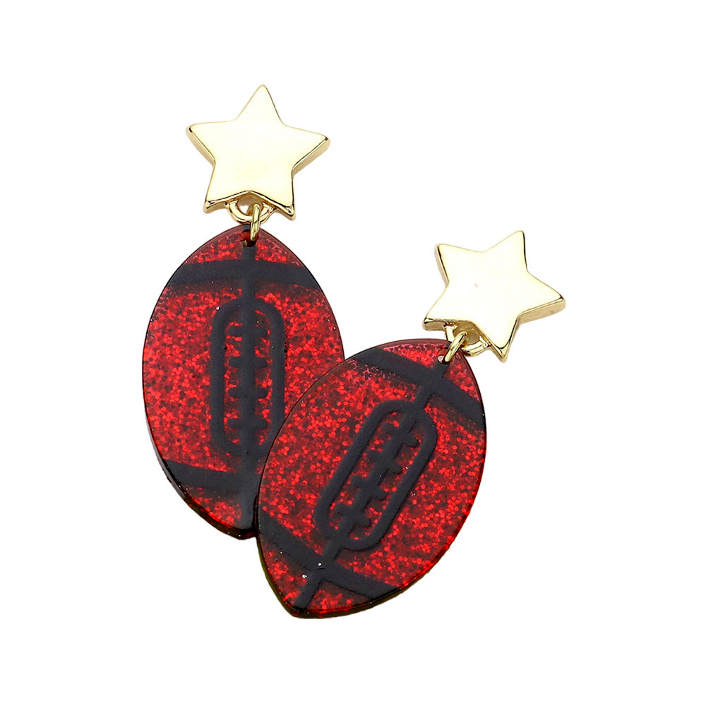 Details • Size : 0.8" X 1.9" • Post Back • Cheer in style with these gameday football earrings featuring star stud tops and bold football-shaped drops. A fun and spirited accessory perfect for tailgates, sports parties, and game day outfits, adding playful energy and team spirit to every celebration. • Lead and Nickel Compliant