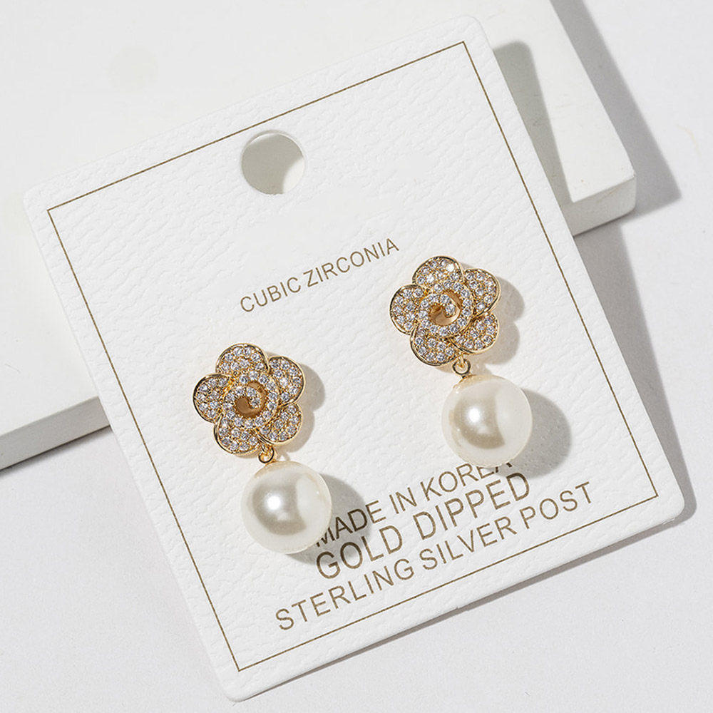 Details • Size : 0.5" X 0.9" • Charming floral stud earrings finished with a graceful drop bead detail for a classic yet feminine look. Designed to elevate everyday outfits, special occasions, and gift assortments, this elegant style offers timeless appeal with a delicate statement that pairs effortlessly with modern and dressy jewelry collections. • CZ Cubic Zirconia • Gold Dipped • Lead and Nickel Compliant • Made In Korea • Sterling Silver Post
