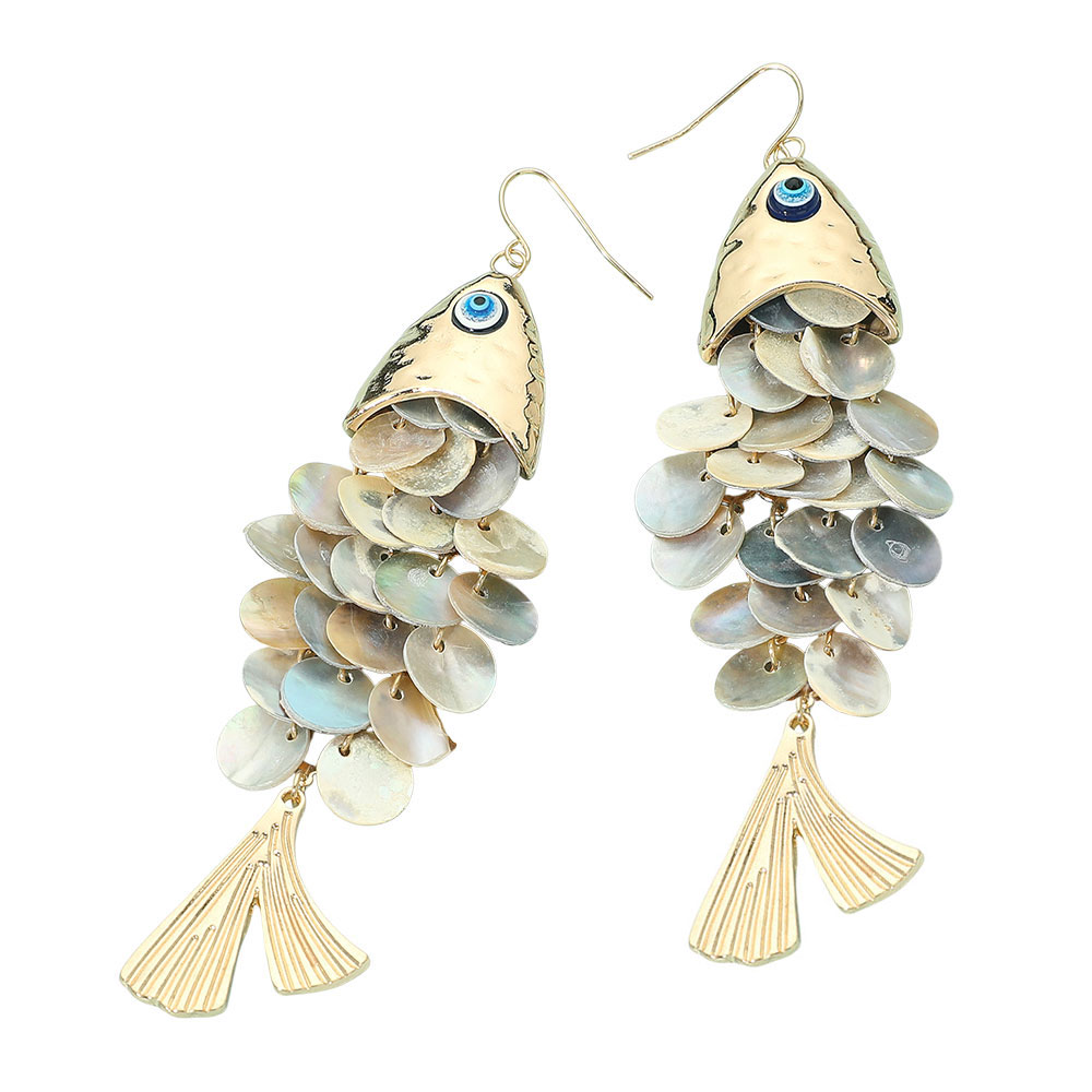 Details • Size : 1.25" X 4.5" • Fish Hook Back • Eye-catching fish dangle earrings featuring layered shell-like scales with golden head and tail details. A playful coastal jewelry piece perfect for beach outings, summer festivals, or ocean-inspired fashion. Lightweight statement earrings that bring unique aquatic charm and whimsical seaside vibes. • Lead and Nickel Compliant
