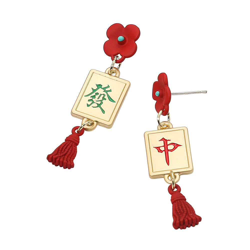 Details • Size : 0.5" X 1.9" • Post Back • Celebrate style and culture with these Mahjong tile tassel earrings featuring floral tops and detailed tile charms. Their unique blend of tradition and trend adds a playful, elegant touch to your outfit. Perfect for parties, festive occasions, or making a bold everyday fashion statement. • Lead and Nickel Compliant